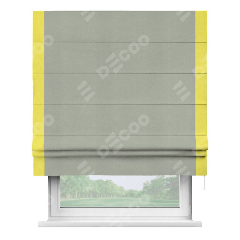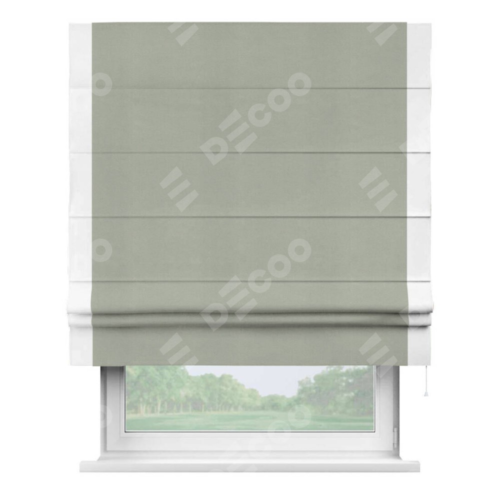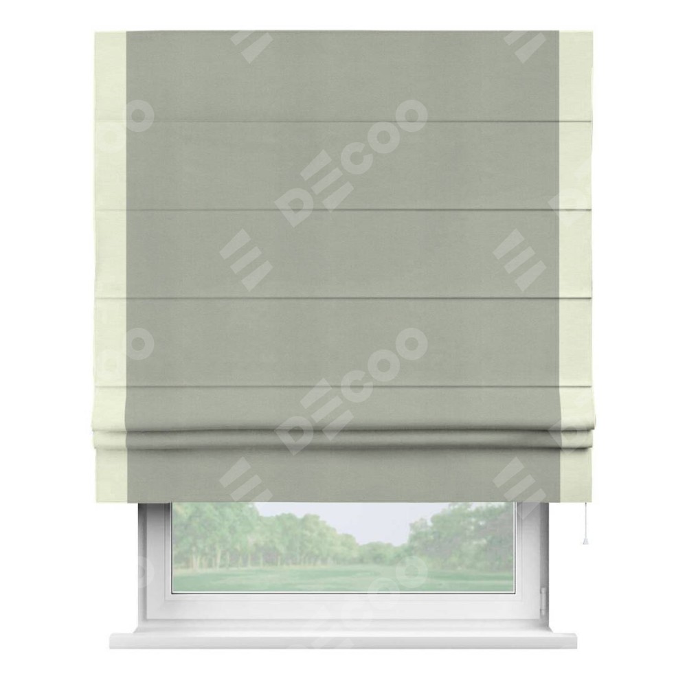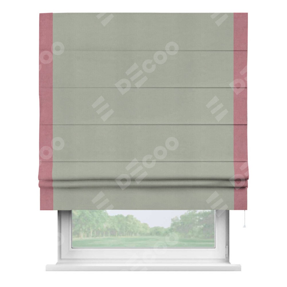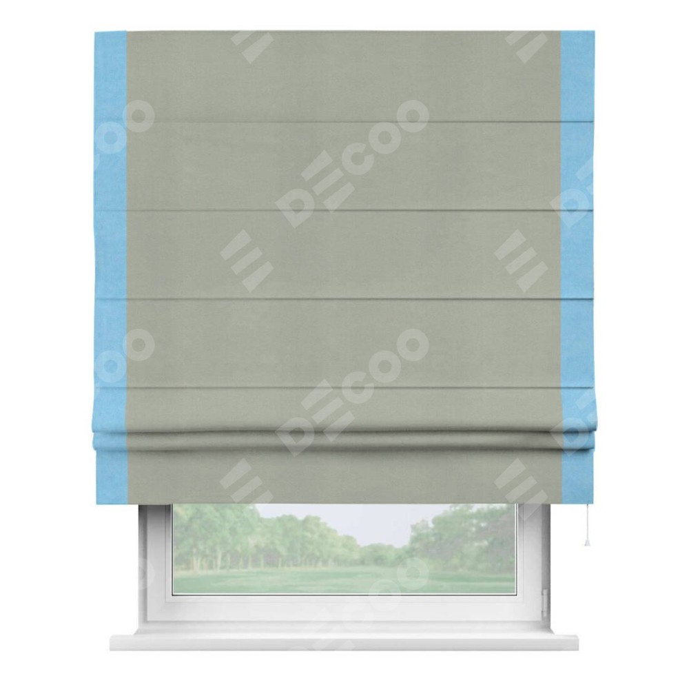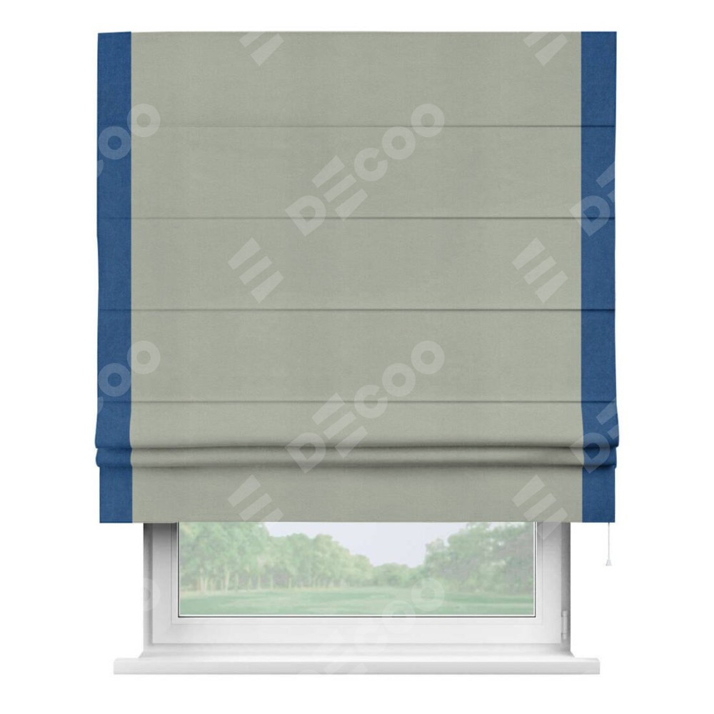 Римская штора производителя «Cortin», используется для проёма, пошита из ткани вельвет cветло-серый, артикул ткани 30981. Отделка шторы кантом «Стрим Дуо», ткань для канта используется из вельвета разной расцветки на выбор. Имеет универсальный механизм и подходит для монтажа: на потолок, на стену и в нишу.
