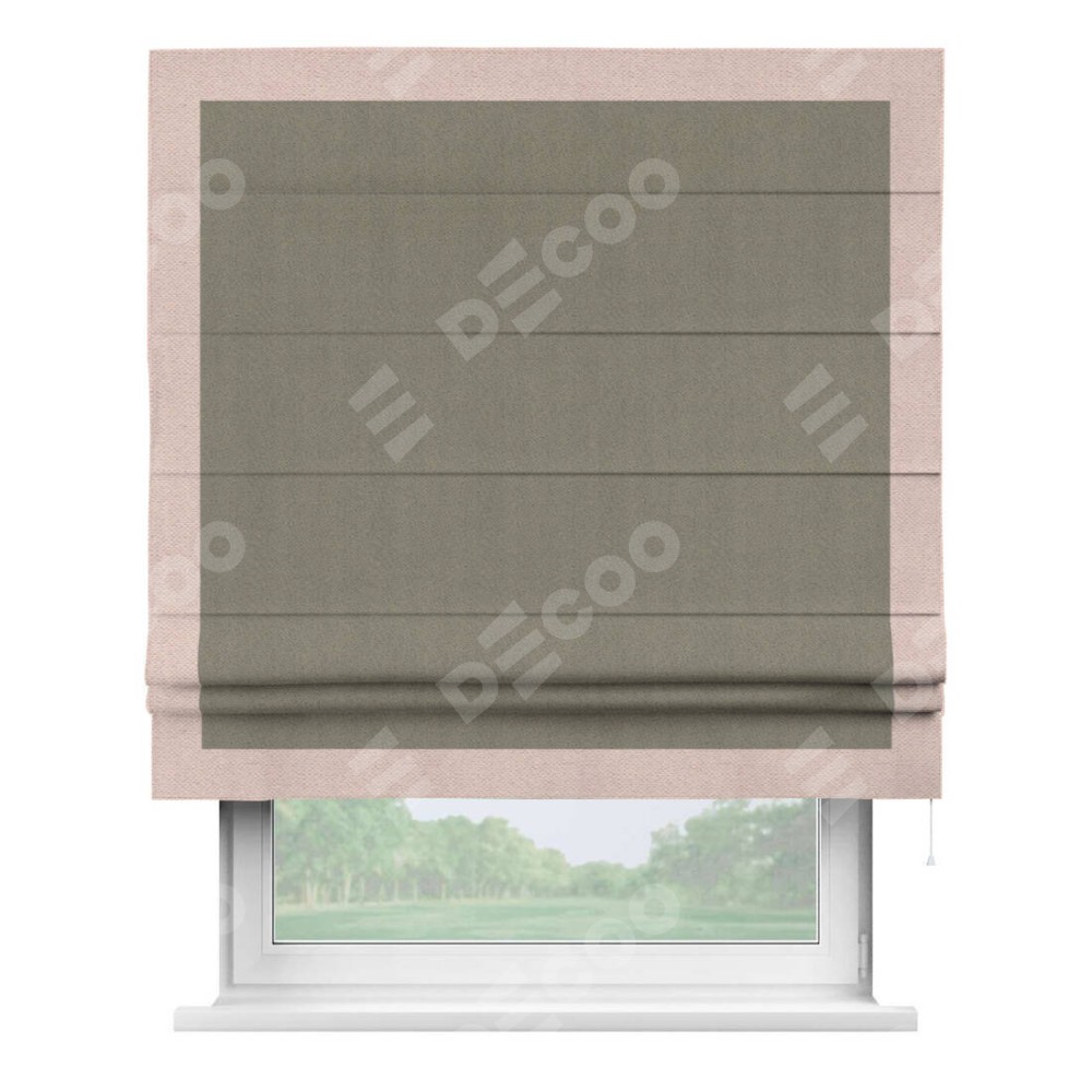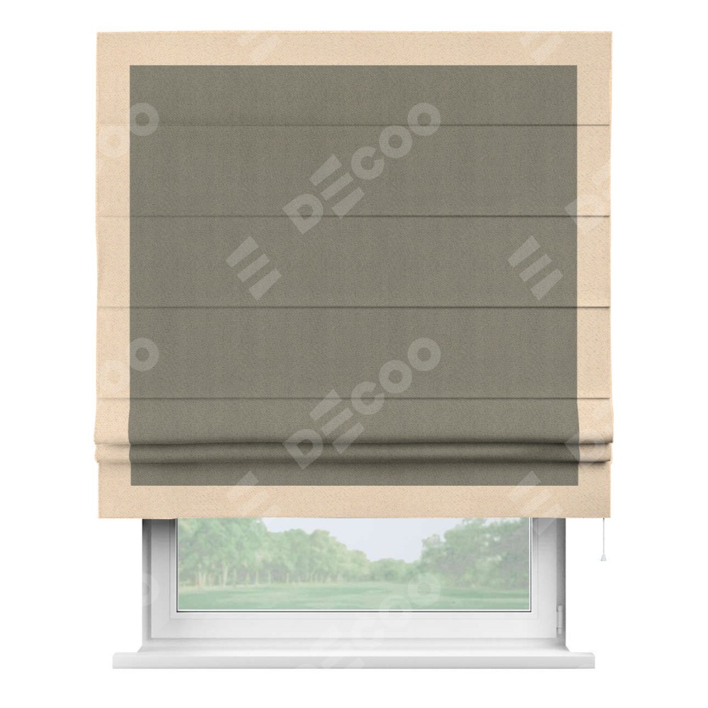 Римская штора производителя «Cortin», используется для проёма, пошита из ткани блэкаут с блеском графитовый, артикул 34648. Отделка шторы кантом «Чесс», ткань для канта используется из блэкаута с блеском разной расцветки на выбор. Изнаночная сторона материала черного цвета, что обеспечивает необходимую светонепроницаемость. Имеет универсальный механизм и подходит для монтажа: на потолок, на стену и в нишу.