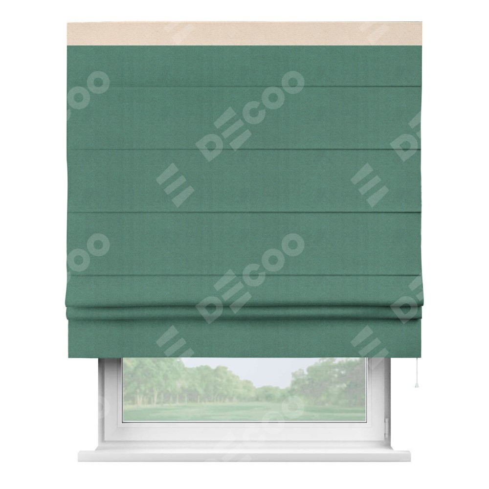 Римская штора производителя «Cortin», используется для проёма, пошита из ткани блэкаут с блеском изумрудный, артикул 34628. Отделка шторы кантом «Кинг», ткань для канта используется из блэкаута с блеском разной расцветки на выбор. Изнаночная сторона материала черного цвета, что обеспечивает необходимую светонепроницаемость. Имеет универсальный механизм и подходит для монтажа: на потолок, на стену и в нишу.