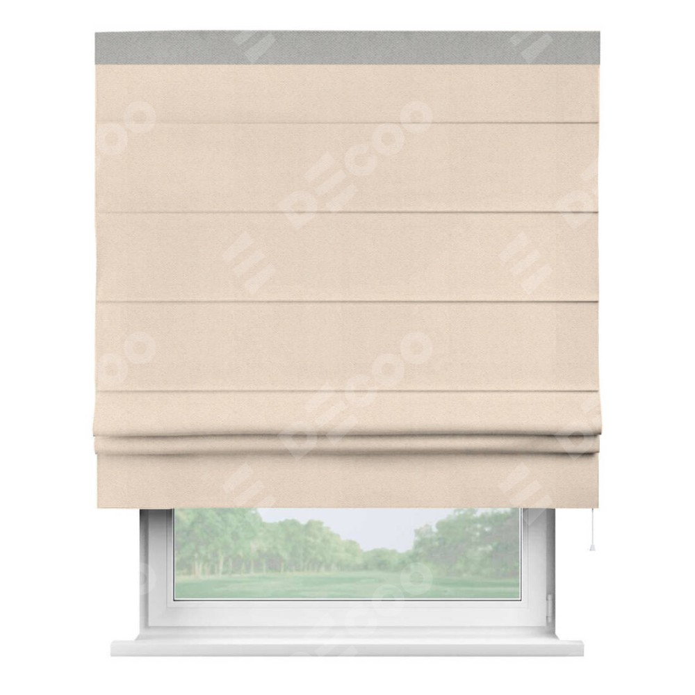 Римская штора производителя «Cortin», используется для проёма, пошита из ткани блэкаут с блеском розовая пудра, артикул 34632. Отделка шторы кантом «Кинг», ткань для канта используется из блэкаута с блеском разной расцветки на выбор. Изнаночная сторона материала черного цвета, что обеспечивает необходимую светонепроницаемость. Имеет универсальный механизм и подходит для монтажа: на потолок, на стену и в нишу.