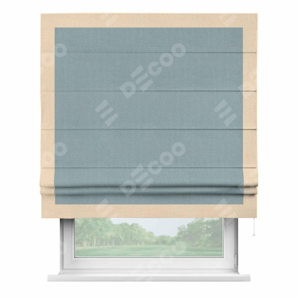 Римская штора производителя «Cortin», используется для проёма, пошита из ткани блэкаут с блеском синий, артикул 34625. Отделка шторы кантом «Чесс», ткань для канта используется из блэкаута с блеском разной расцветки на выбор. Изнаночная сторона материала черного цвета, что обеспечивает необходимую светонепроницаемость. Имеет универсальный механизм и подходит для монтажа: на потолок, на стену и в нишу.