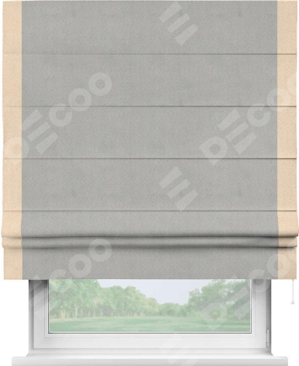 Римская штора производителя «Cortin», используется для проёма, пошита из ткани блэкаут с блеском тёмно-серый, артикул 34634. Отделка шторы кантом «Стрим Дуо», ткань для канта используется из блэкаута с блеском разной расцветки на выбор. Изнаночная сторона материала черного цвета, что обеспечивает необходимую светонепроницаемость. Имеет универсальный механизм и подходит для монтажа: на потолок, на стену и в нишу.