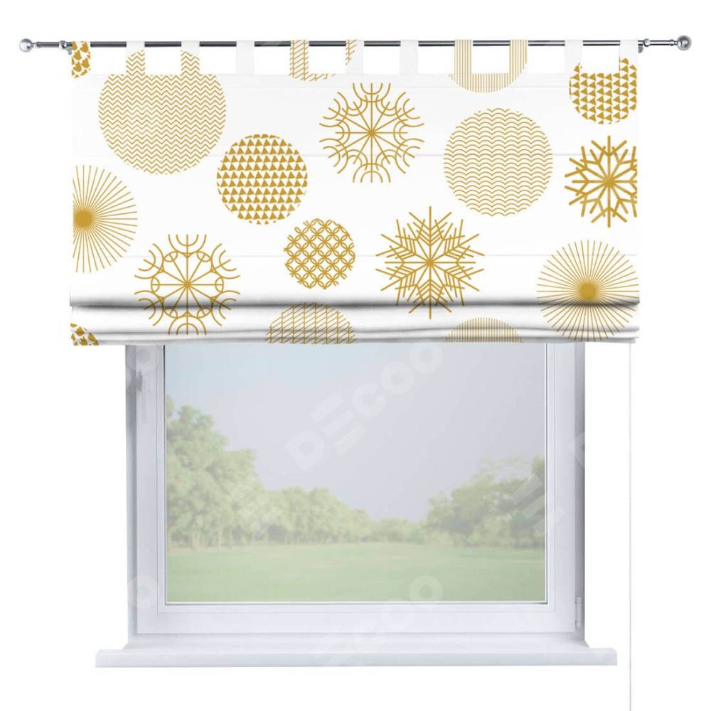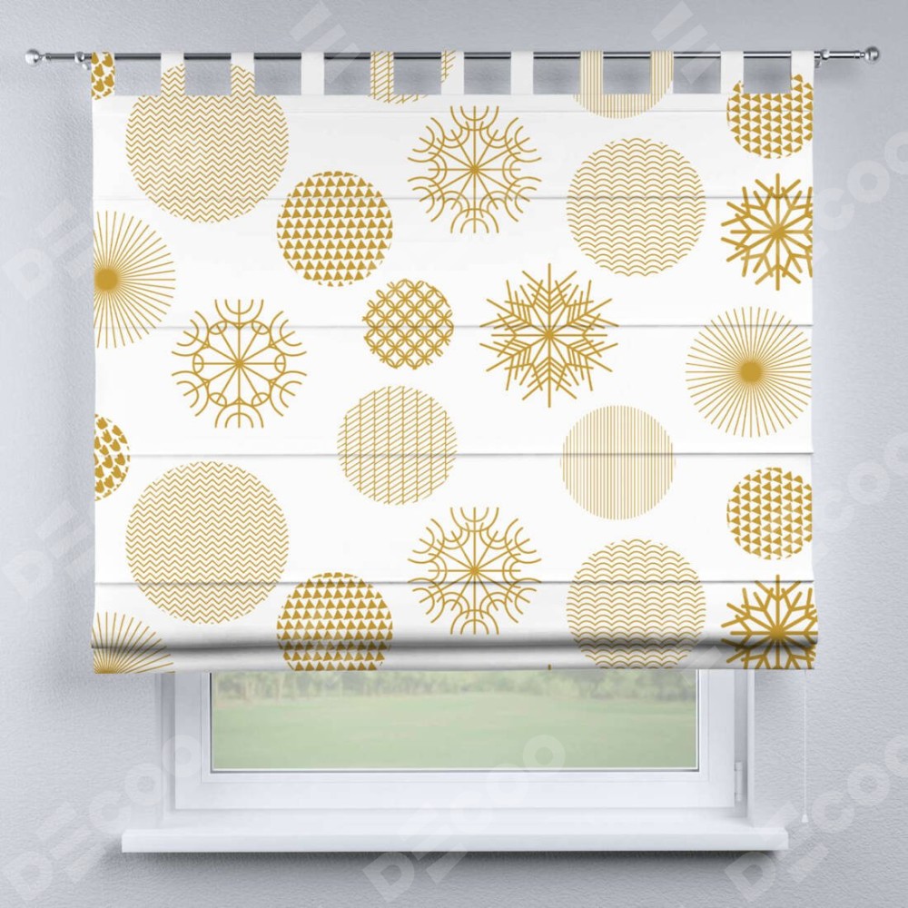 Римская штора производителя «Cortin», используется для проёма, пошита из ткани блэкаут с нанесением сублимационной печати «Золотые шары». Данная модель пошита на петлях, комплектуется на выбор круглым карнизом и подходит для монтажа на стену. Римская штора на петлях имеет простую систему регулировки высоты, отличительным преимуществом данной модели является простой способ монтажа. Достаточно повесить ее на трубу и штора готова!