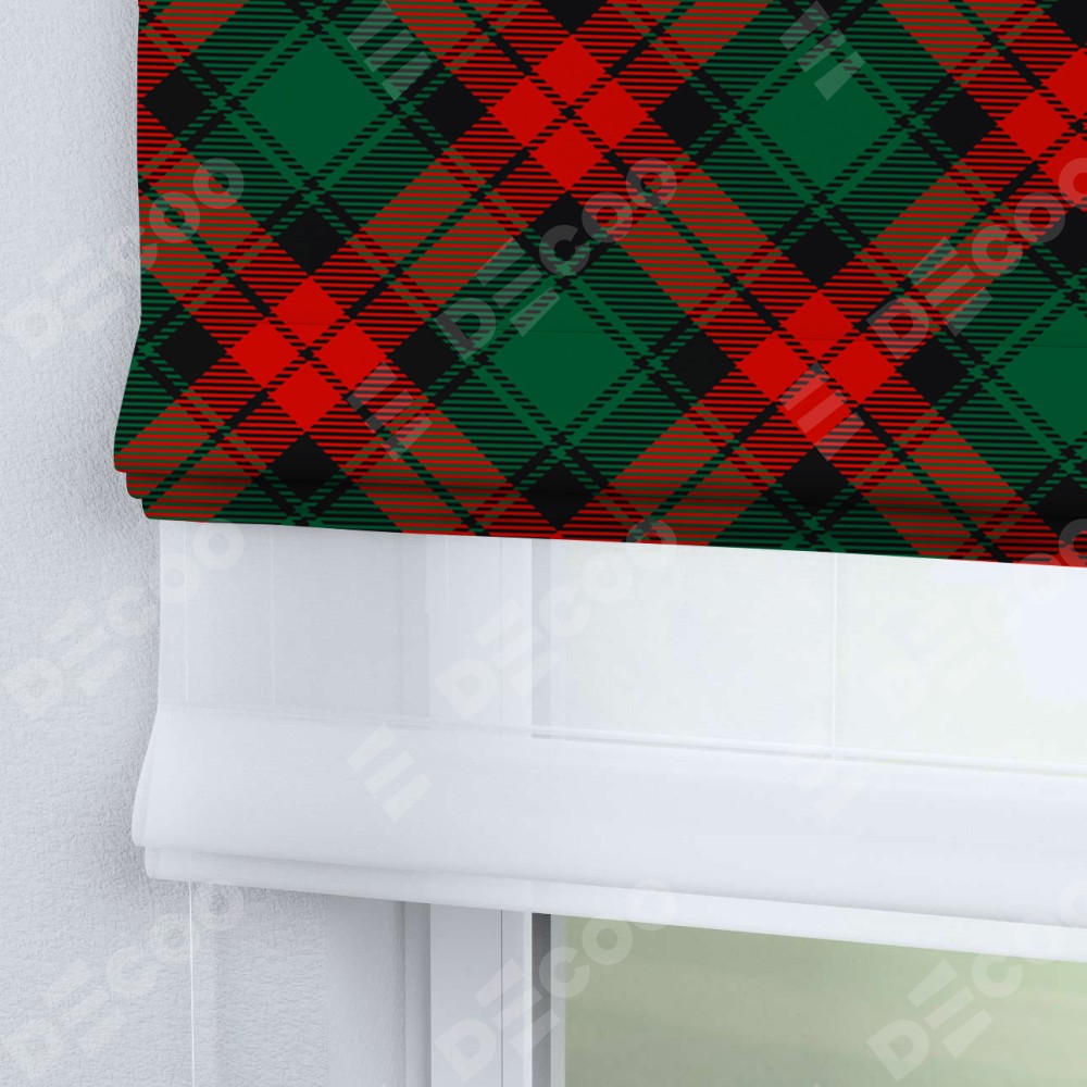 Римская штора день-ночь производителя «Cortin», используется для проёма, пошита из двух полотен, с лицевой блэкаут с нанесением сублимационной печати «Красно-зелёная клетка», вторая ткань тюль (по стандарту комплектуется тюль белого цвета артикул V-01). Имеет универсальный механизм и подходит для монтажа: на потолок, на стену и в нишу.