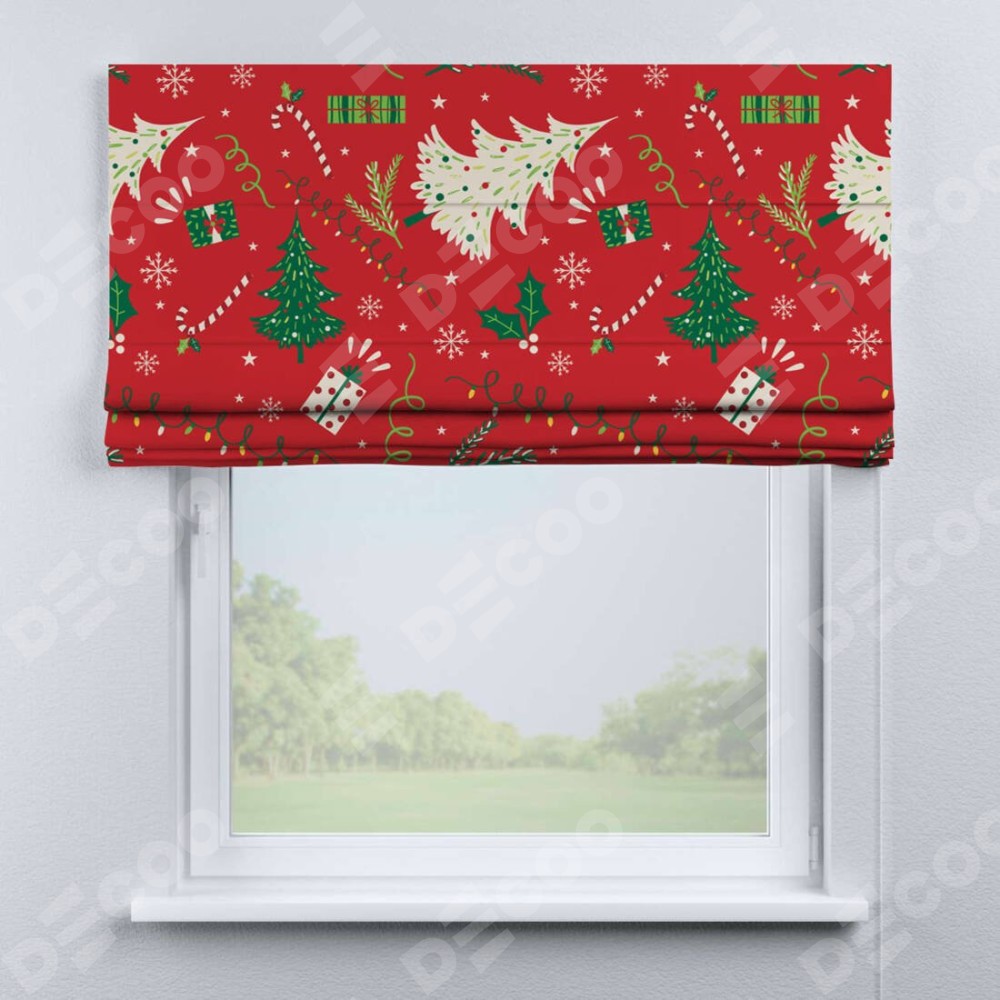 Римская штора производителя «Cortin», используется для проёма, пошита из ткани блэкаут с нанесением сублимационной печати «Новогодние подарки». Имеет универсальный механизм и подходит для монтажа: на потолок, на стену и в нишу.