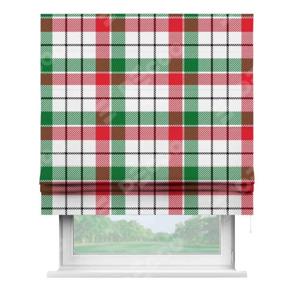 Римская штора производителя «Cortin», используется для проёма, пошита из ткани блэкаут с нанесением сублимационной печати «Трёхцветная клетка». Имеет универсальный механизм и подходит для монтажа: на потолок, на стену и в нишу.