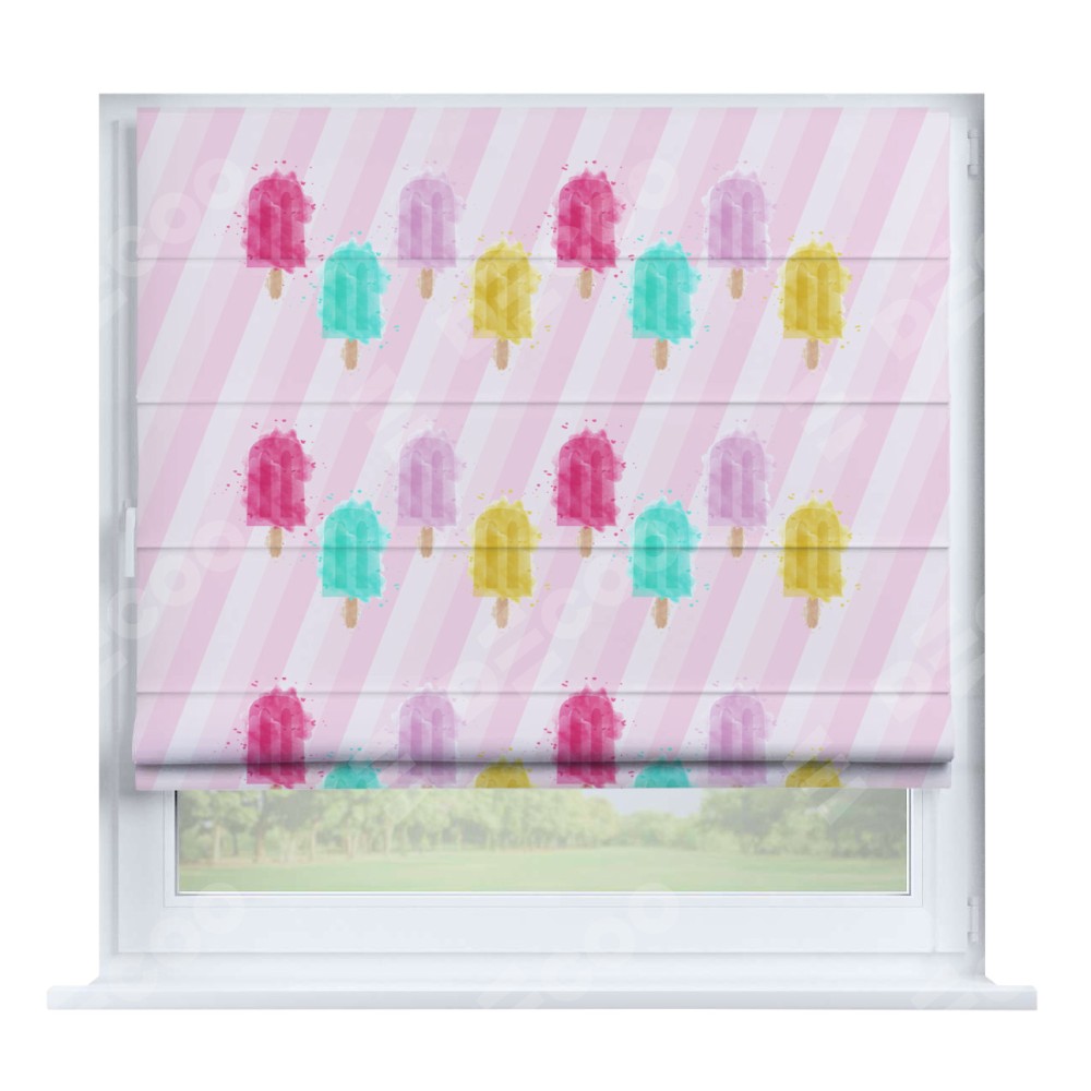 Римская штора производителя «Cortin», устанавливается на створку окна, пошита из ткани блэкаут с нанесением сублимационной печати «Фруктовое мороженое». Штора шьётся по индивидуальным размерам, для данного типа римской шторы возможная ширина от 35 до 150 см., высота до 250 см.