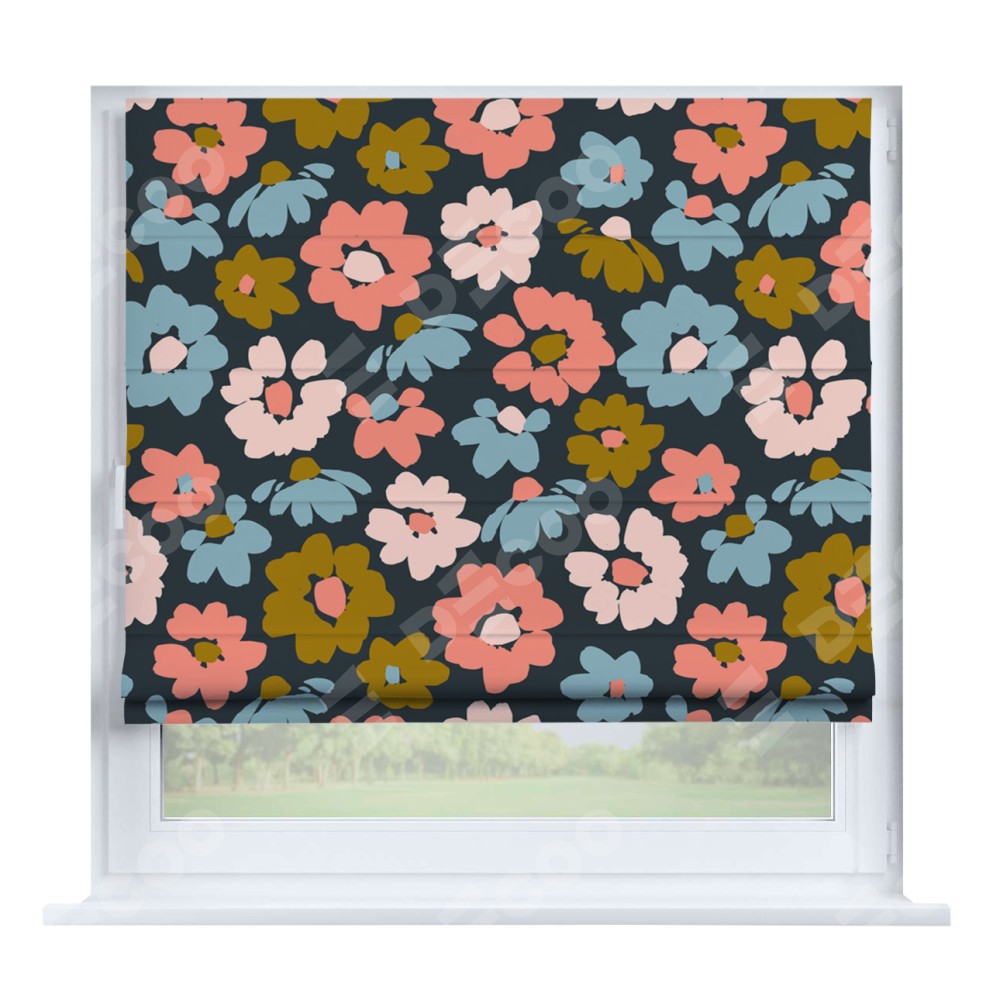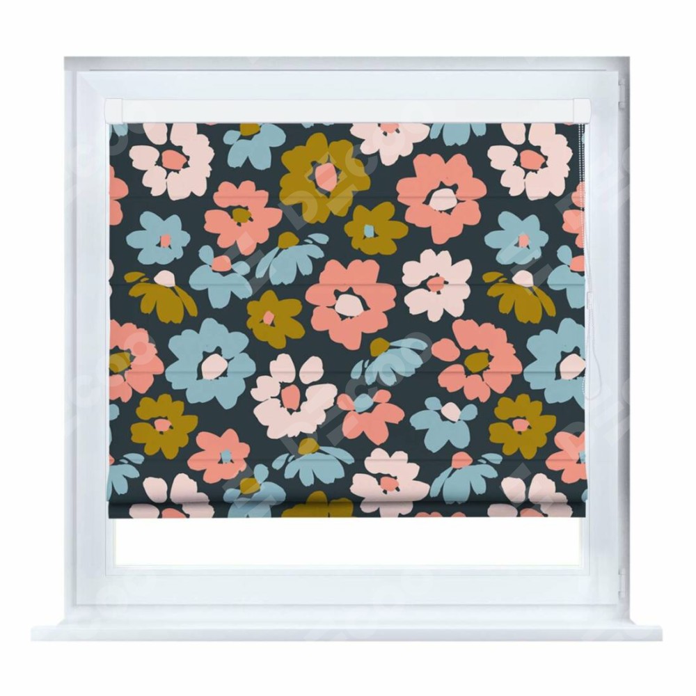 Римская штора производителя «Cortin», устанавливается на створку окна, пошита из ткани блэкаут с нанесением сублимационной печати «Яркие цветы». Штора шьётся по индивидуальным размерам, для данного типа римской шторы возможная ширина от 35 до 150 см., высота до 250 см.