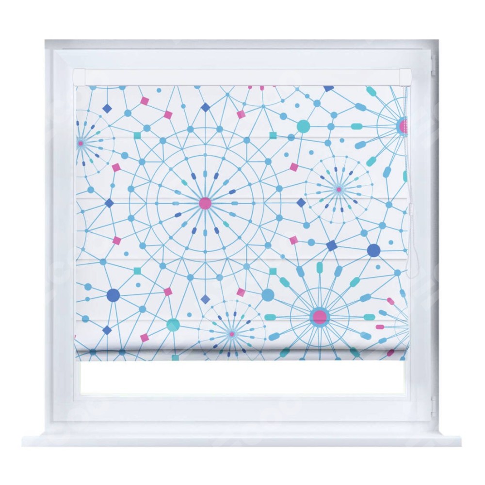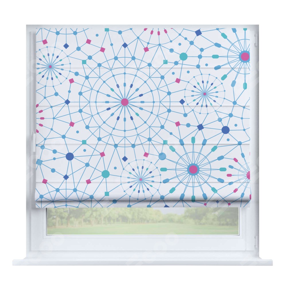 Римская штора производителя «Cortin», устанавливается на створку окна, пошита из ткани блэкаут с нанесением сублимационной печати «Круги и линии». Штора шьётся по индивидуальным размерам, для данного типа римской шторы возможная ширина от 35 до 150 см., высота до 250 см.