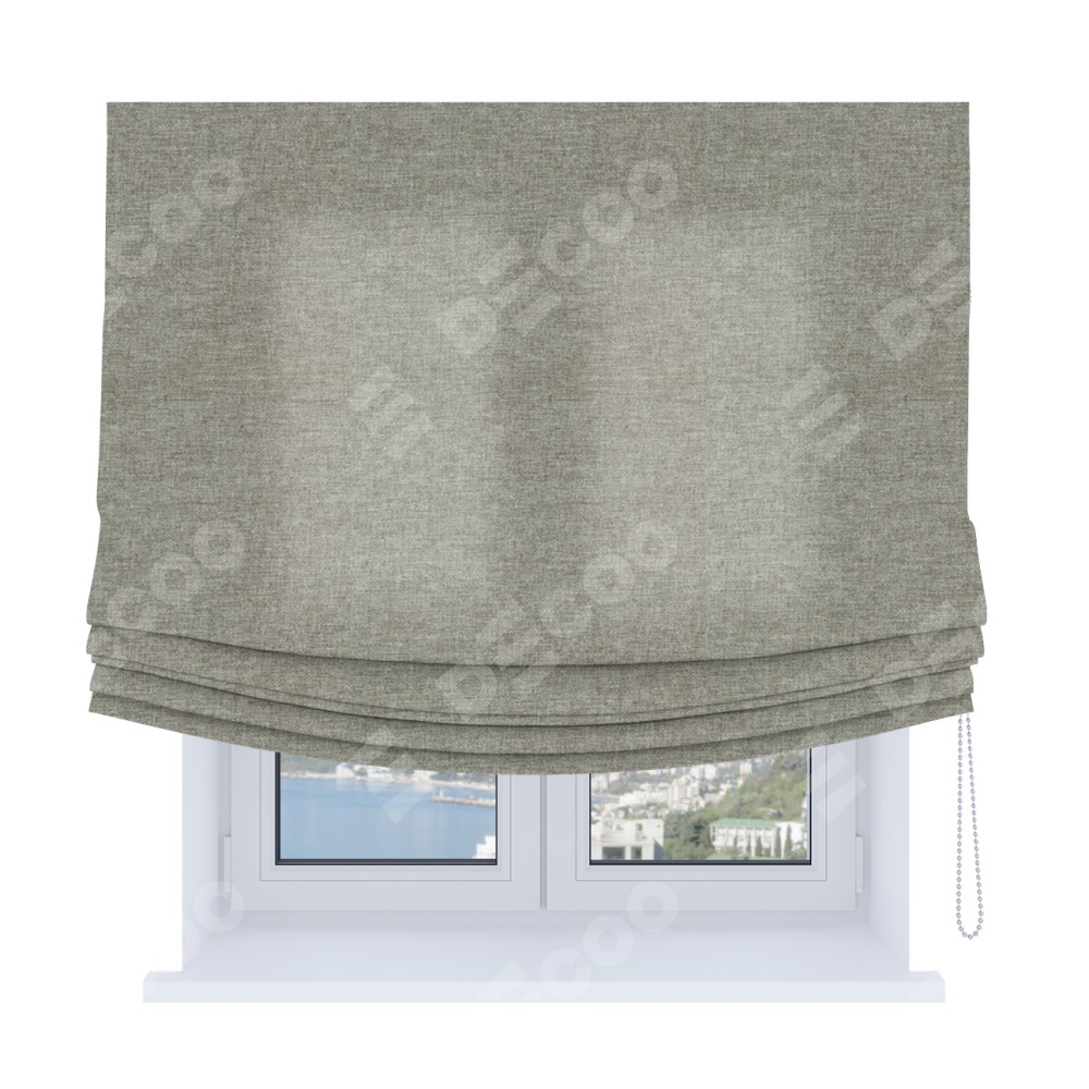 Римская штора Soft производителя «Cortin», используется для проёма, пошита из ткани лён кашемир серый, артикул ткани 17208. Имеет универсальный механизм и подходит для монтажа: на потолок, на стену и в нишу. В отличие от стандартных римских штор, римская штора Soft не имеет горизонтальных вставок и нижнего отвеса. Это позволяет ткани произвольно драпироваться в свободные мягкие складки.