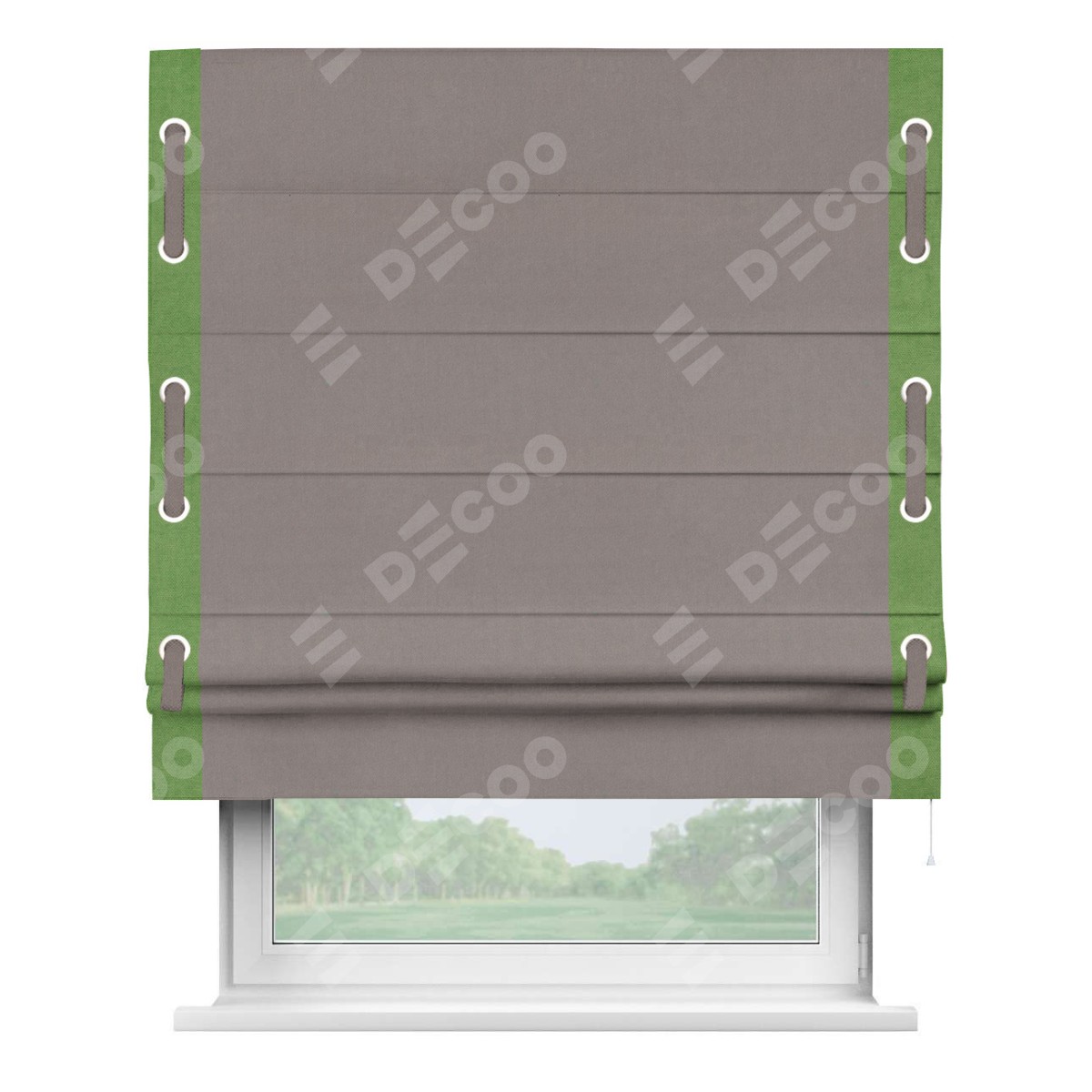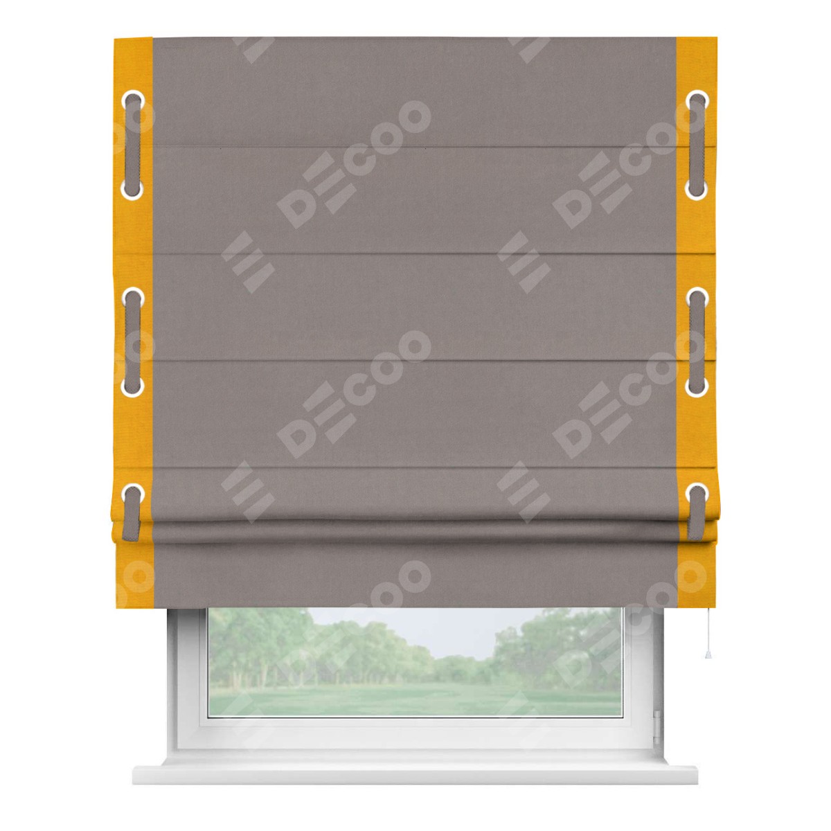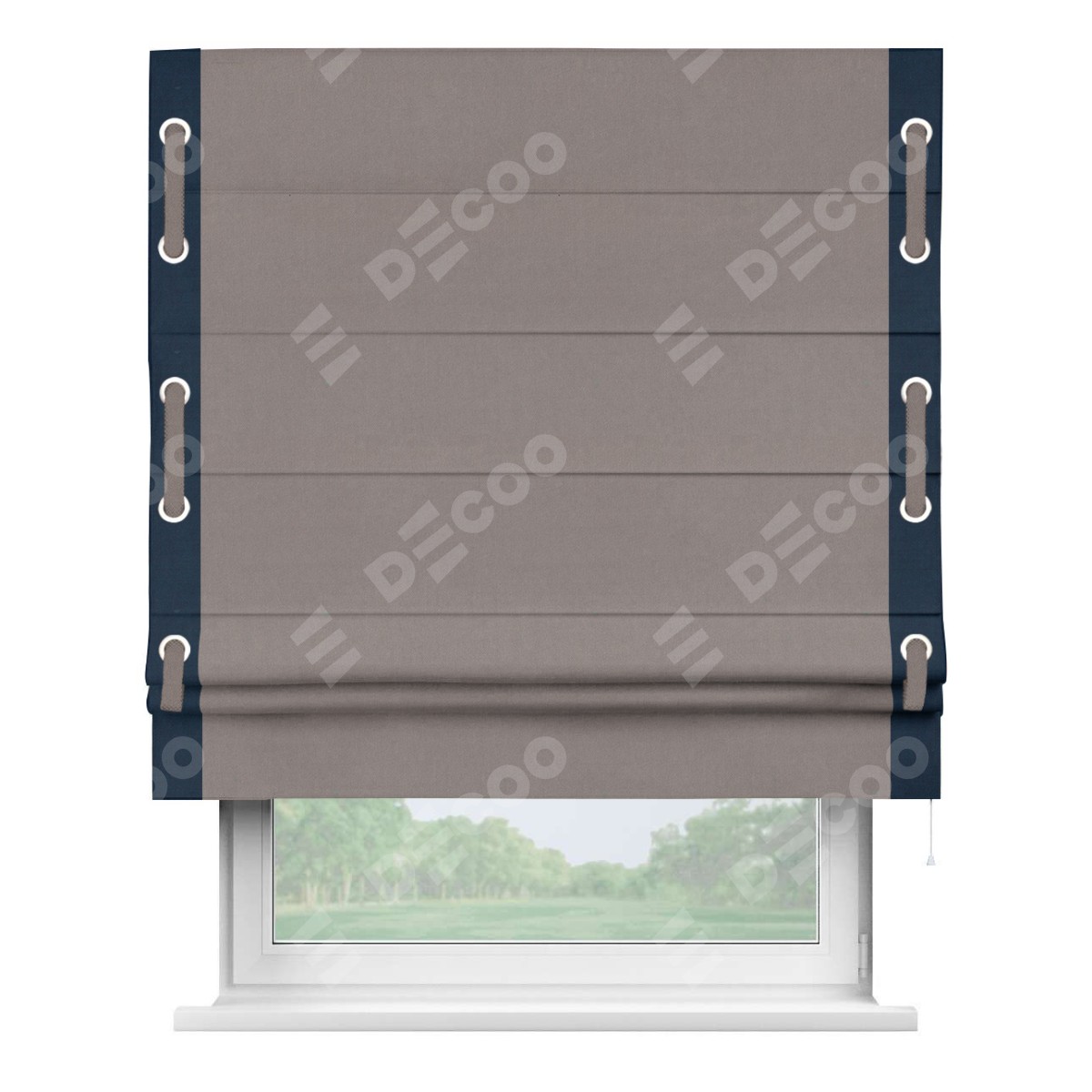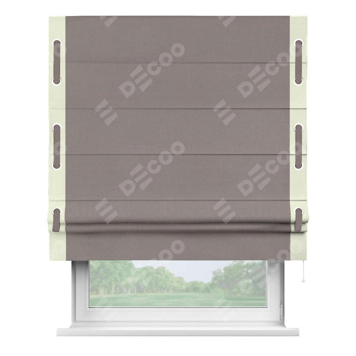 Римская штора производителя «Cortin», используется для проёма, пошита из ткани вельвет темно-бежевый, артикул ткани 82527. Отделка шторы кантом «Стрим Дуо» на кантах расположены люверсы с пояском, ткань для канта используется из вельвета разной расцветки на выбор. Ткань для пояска обычно используется из основной ткани шторы, а так же можно сделать из любой расцветки по желанию. Имеет универсальный механизм и подходит для монтажа: на потолок, на стену и в нишу.