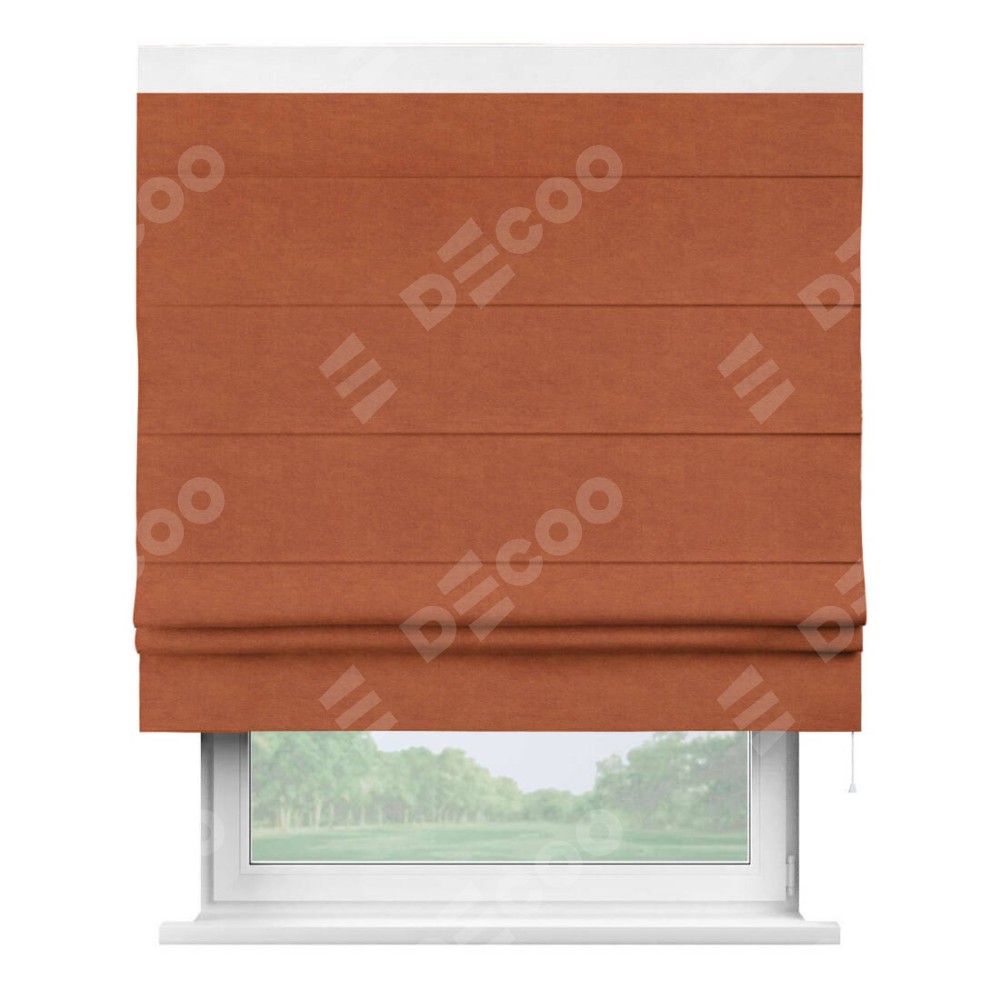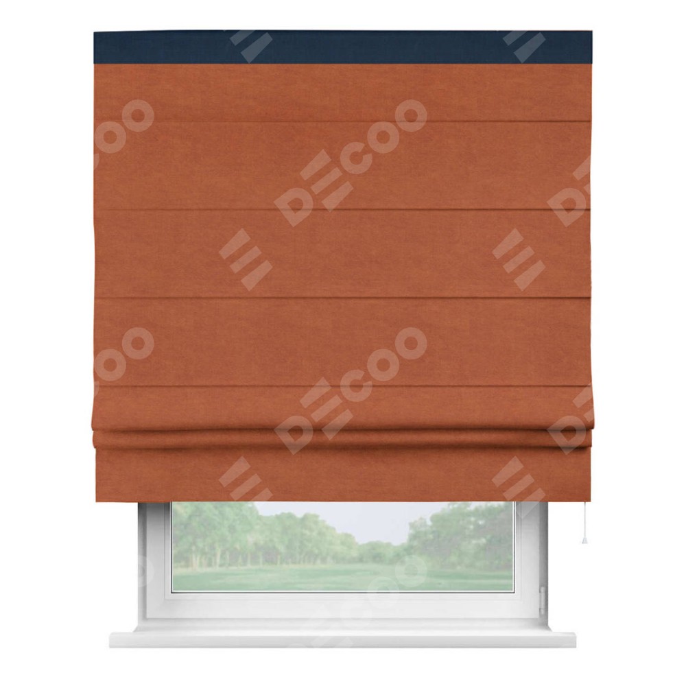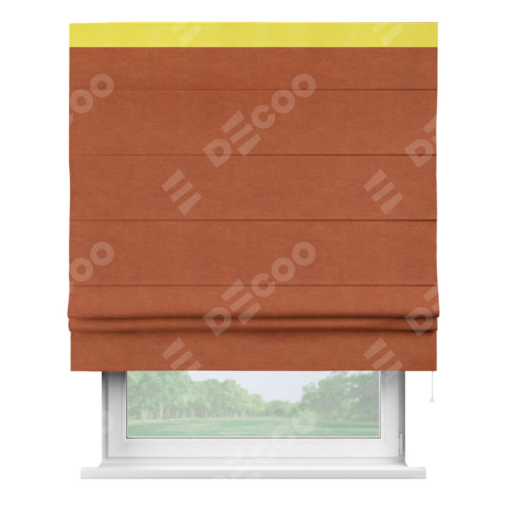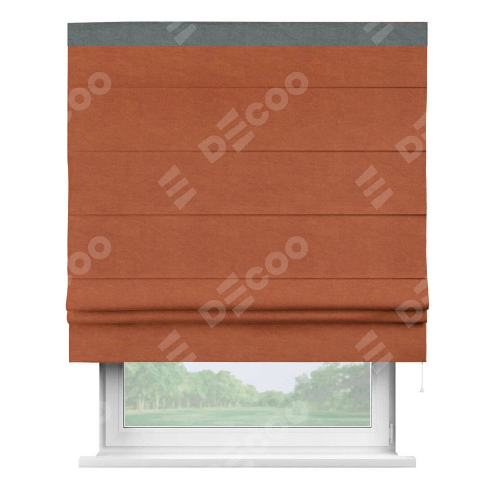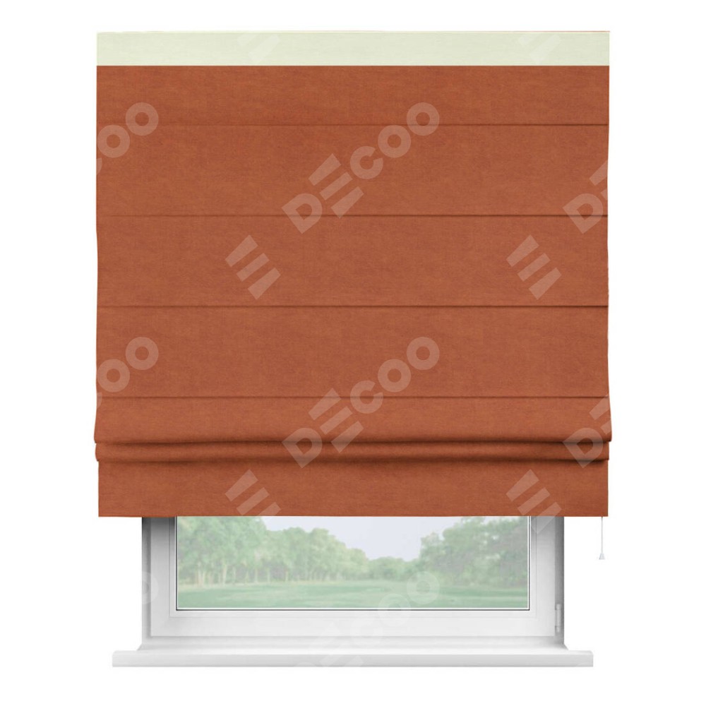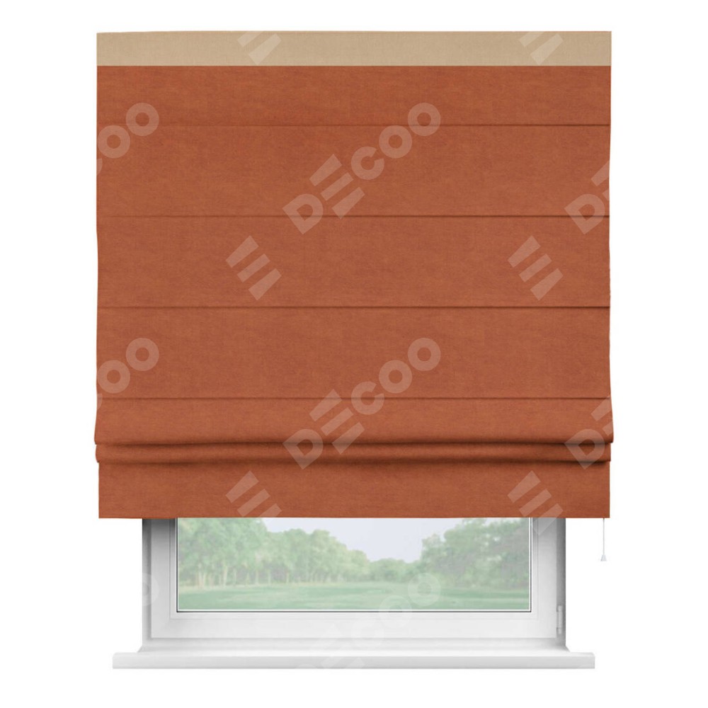 Римская штора производителя «Cortin», используется для проёма, пошита из ткани вельвет терракотовый, артикул ткани 85548. Отделка шторы кантом «Кинг», ткань для канта используется из вельвета разной расцветки на выбор. Имеет универсальный механизм и подходит для монтажа: на потолок, на стену и в нишу.