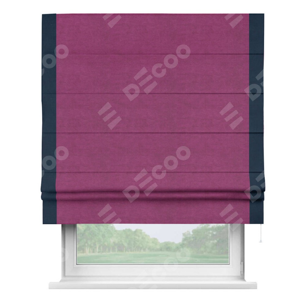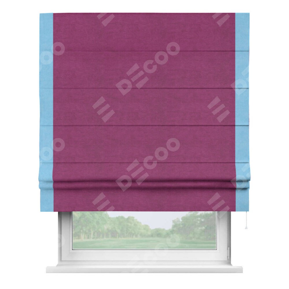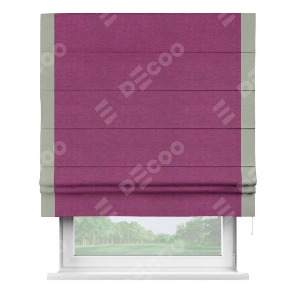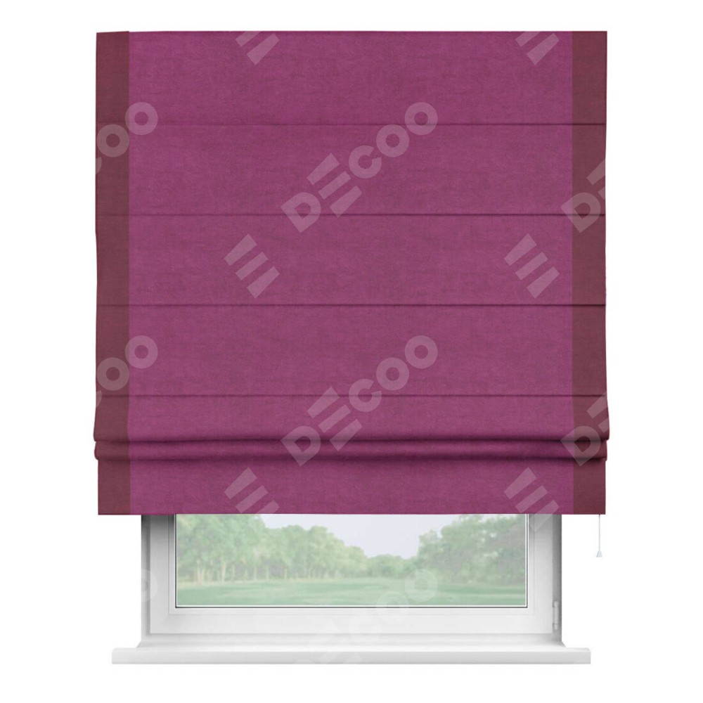 Римская штора производителя «Cortin», используется для проёма, пошита из ткани вельвет фиолетовый, артикул ткани 85552. Отделка шторы кантом «Стрим Дуо», ткань для канта используется из вельвета разной расцветки на выбор. Имеет универсальный механизм и подходит для монтажа: на потолок, на стену и в нишу.
