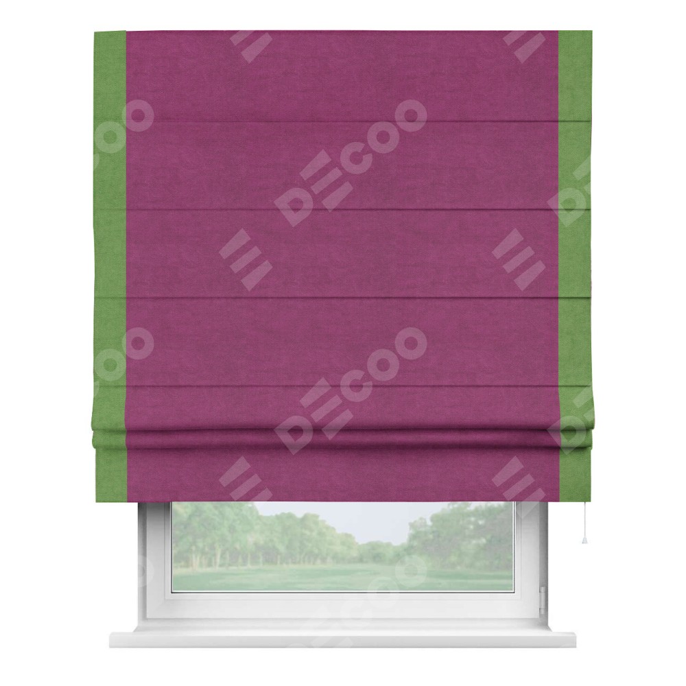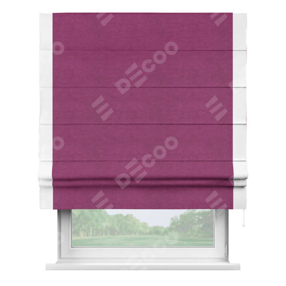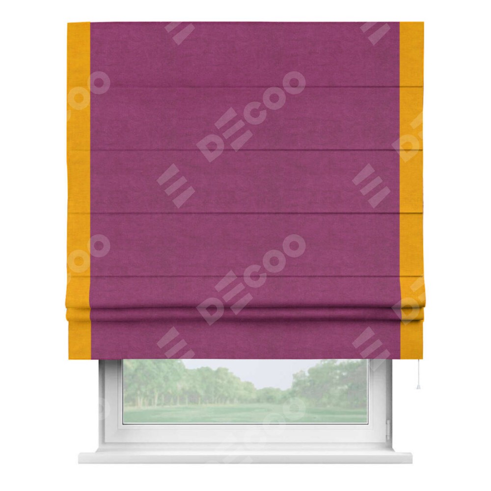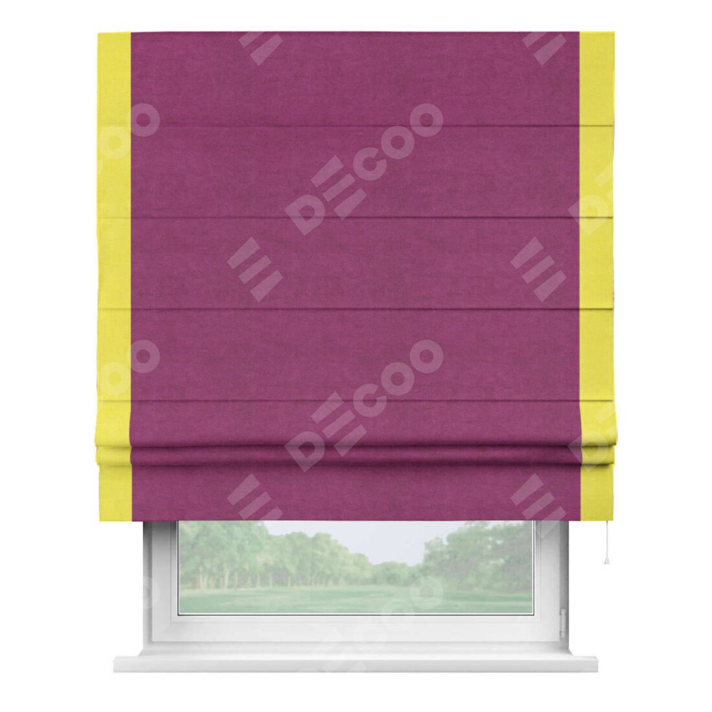 Римская штора производителя «Cortin», используется для проёма, пошита из ткани вельвет фиолетовый, артикул ткани 85552. Отделка шторы кантом «Стрим Дуо», ткань для канта используется из вельвета разной расцветки на выбор. Имеет универсальный механизм и подходит для монтажа: на потолок, на стену и в нишу.