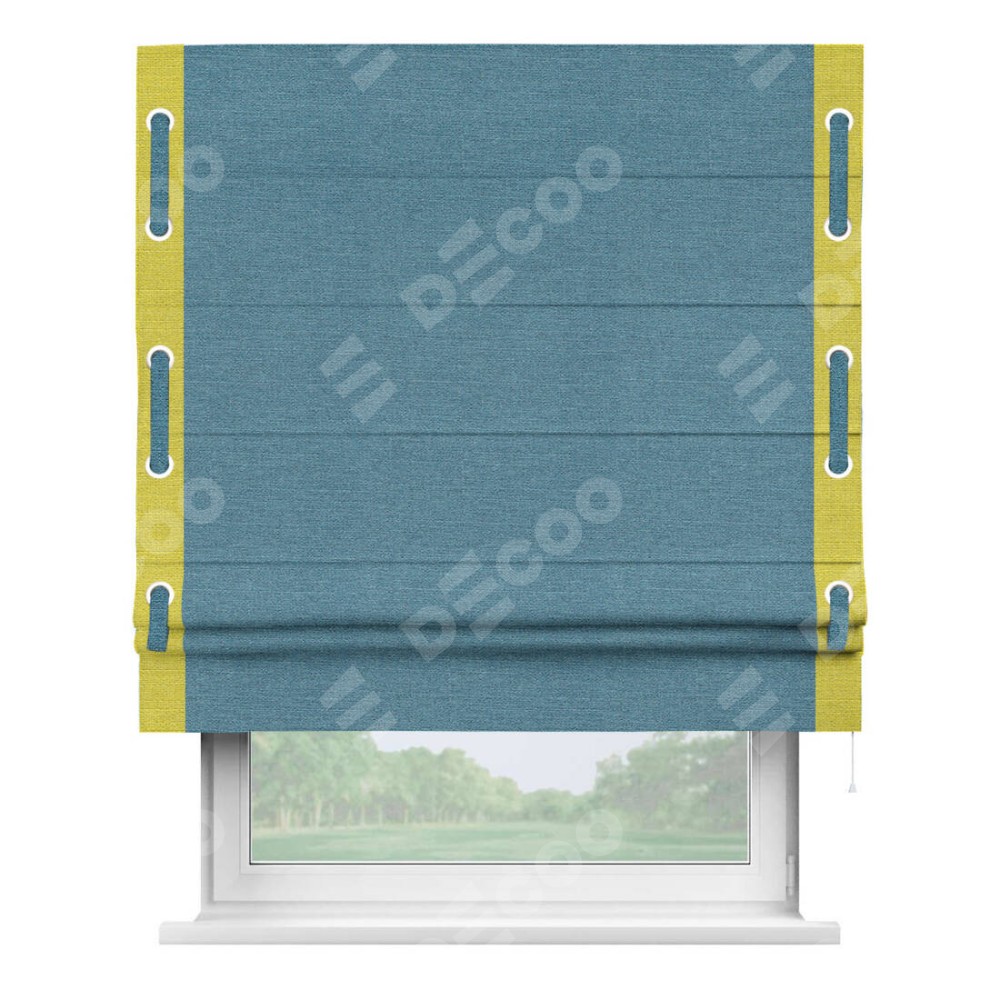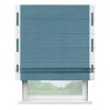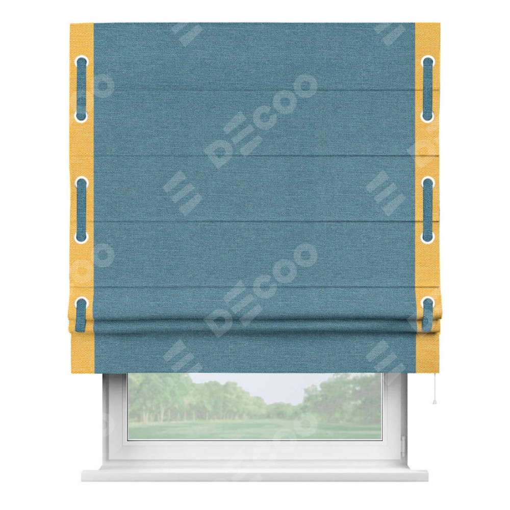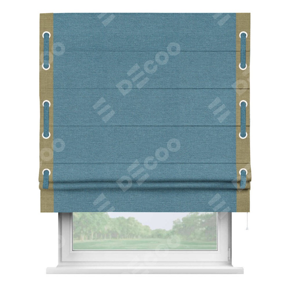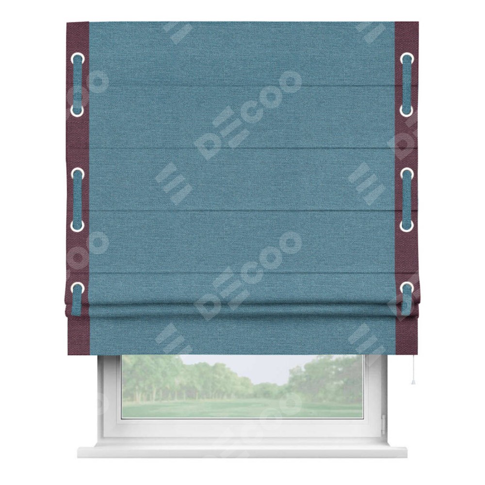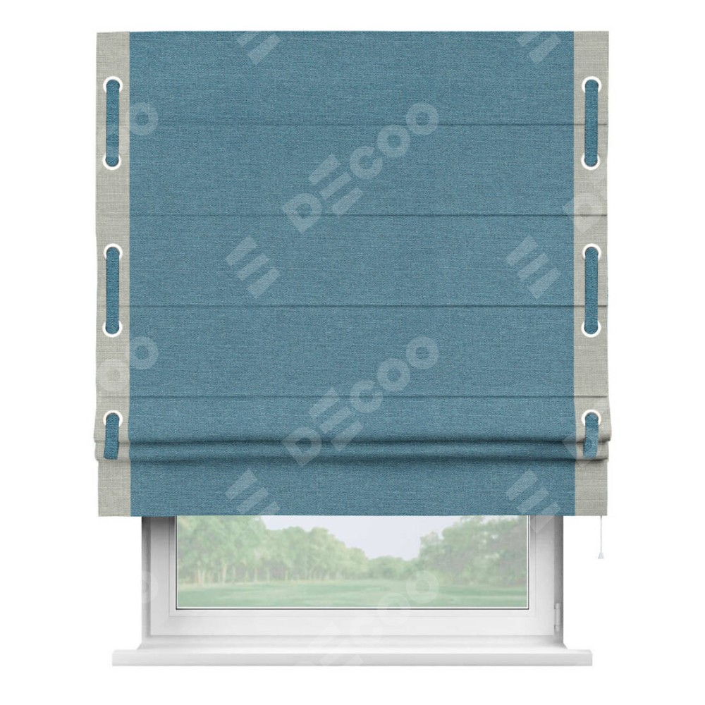 Римская штора производителя «Cortin», используется для проёма, пошита из ткани лён голубой, артикул 63741. Отделка шторы кантом «Стрим Дуо» на кантах расположены люверсы с пояском, ткань для канта используется из льна разной расцветки на выбор. Ткань для пояска обычно используется из основной ткани шторы, а так же можно сделать из любой расцветки по желанию. Имеет универсальный механизм и подходит для монтажа: на потолок, на стену и в нишу.