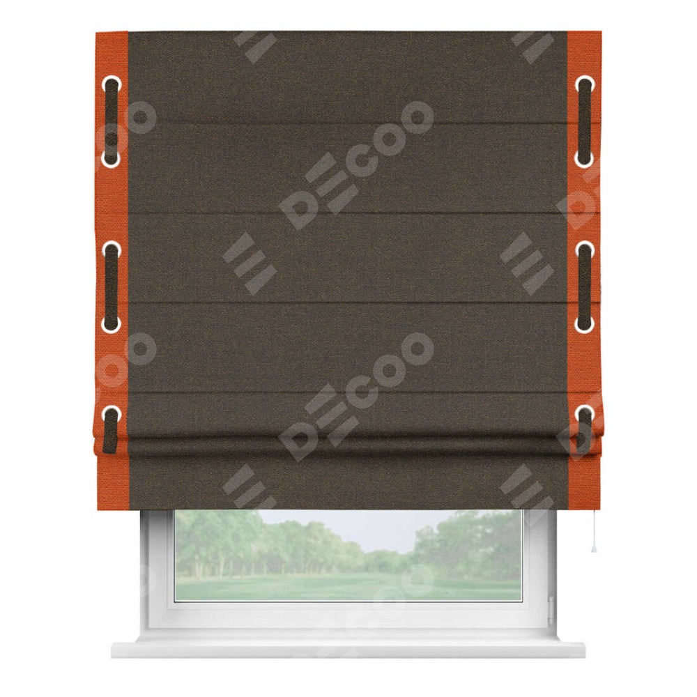 Римская штора производителя «Cortin», используется для проёма, пошита из ткани лён темно-коричневый, артикул 53444. Отделка шторы кантом «Стрим Дуо» на кантах расположены люверсы с пояском, ткань для канта используется из льна разной расцветки на выбор. Ткань для пояска обычно используется из основной ткани шторы, а так же можно сделать из любой расцветки по желанию. Имеет универсальный механизм и подходит для монтажа: на потолок, на стену и в нишу.