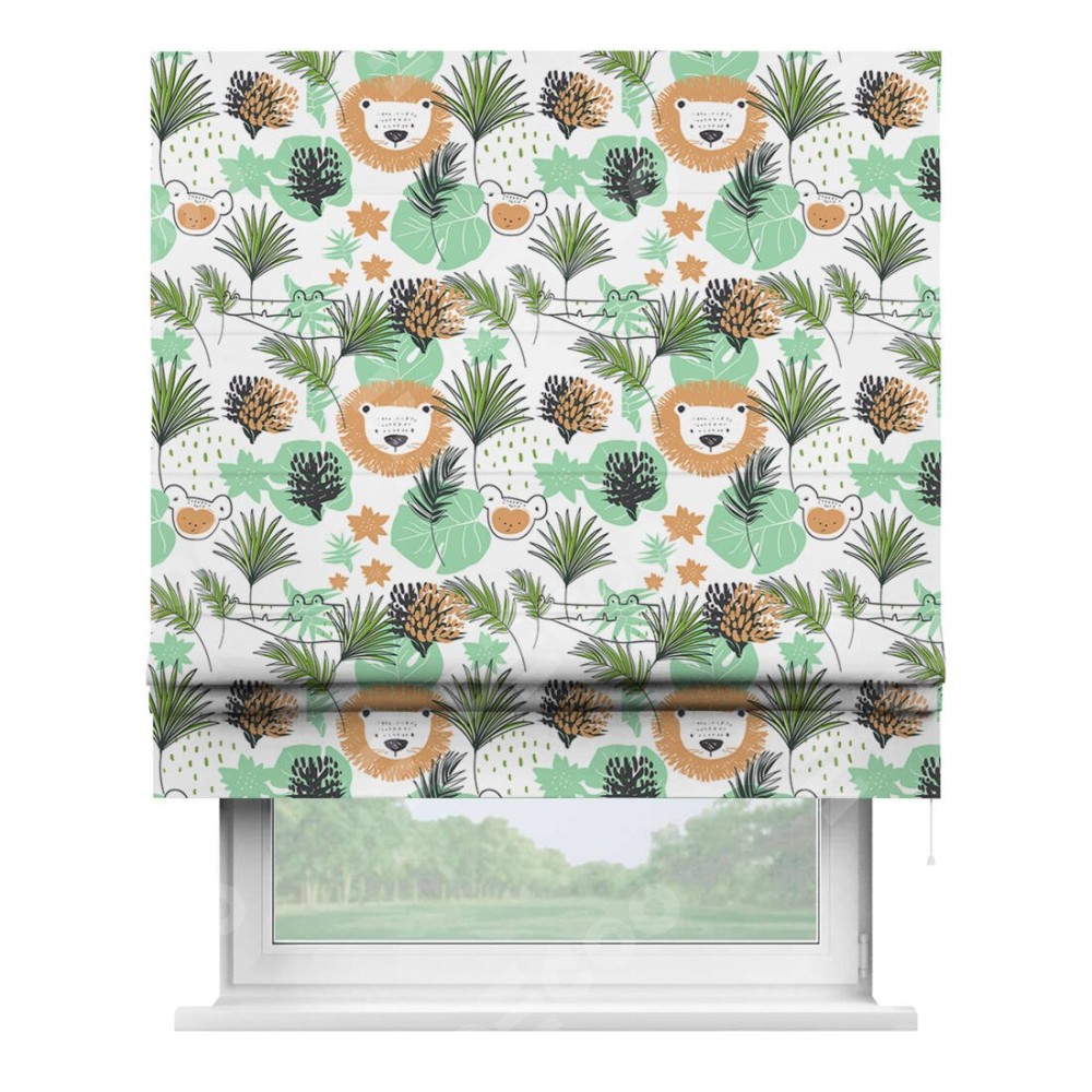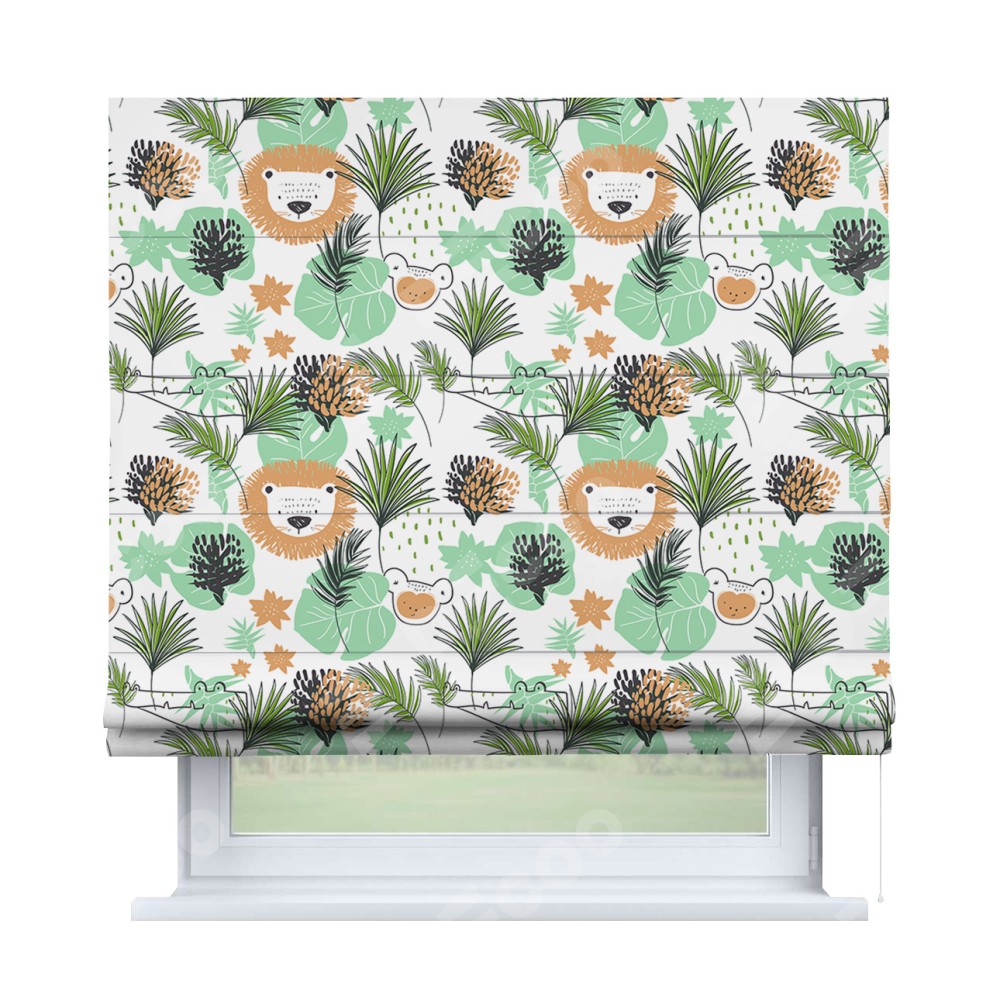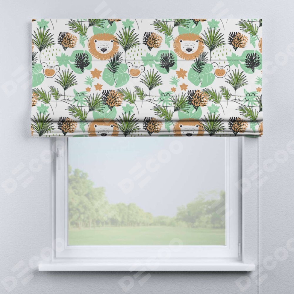 Римская штора производителя «Cortin», используется для проёма, пошита из ткани блэкаут с нанесением сублимационной печати «Животные из джунглей». Имеет универсальный механизм и подходит для монтажа: на потолок, на стену и в нишу.
