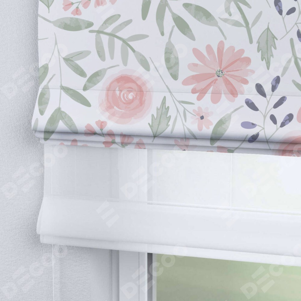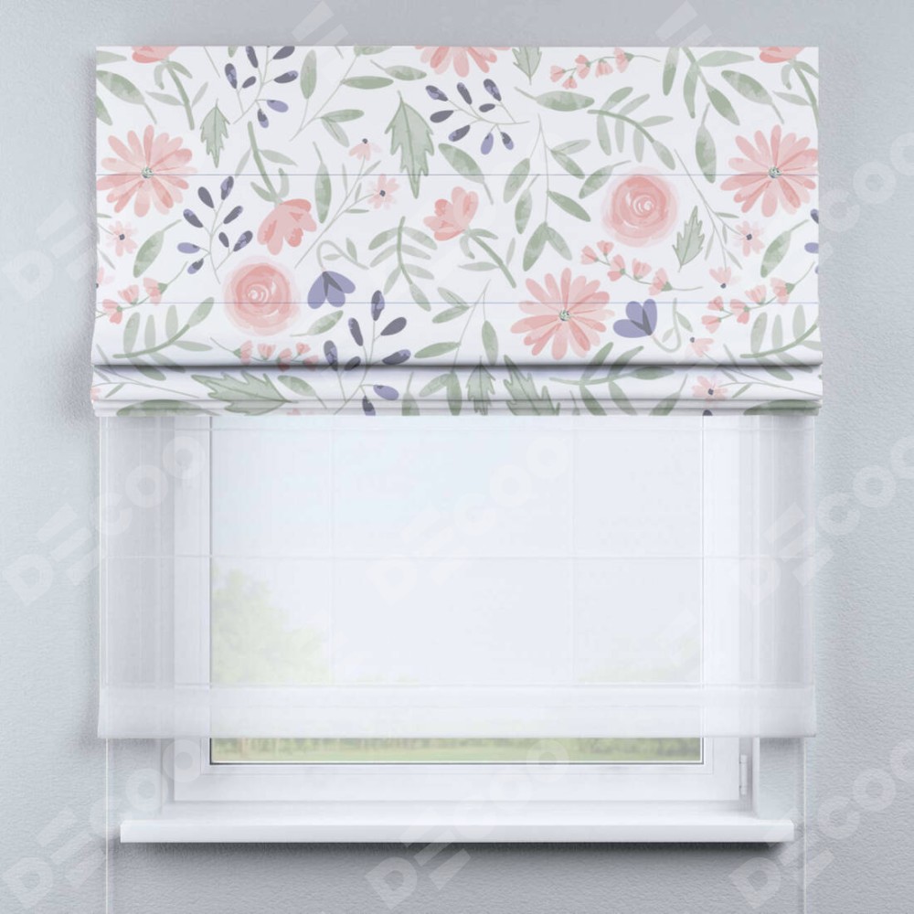 Римская штора день-ночь производителя «Cortin», используется для проёма, пошита из двух полотен, с лицевой блэкаут с нанесением сублимационной печати «Изысканные цветы», вторая ткань тюль (по стандарту комплектуется тюль белого цвета артикул V-01). Имеет универсальный механизм и подходит для монтажа: на потолок, на стену и в нишу.