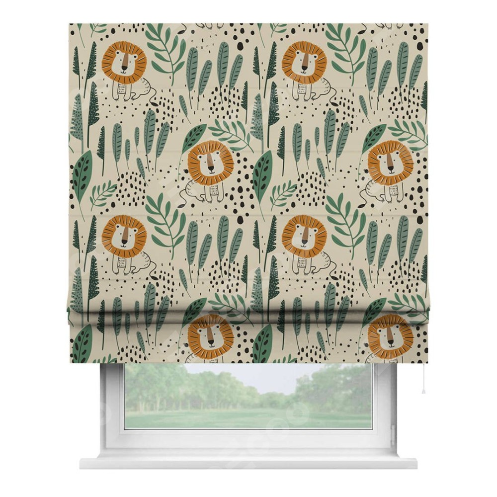 Римская штора производителя «Cortin», используется для проёма, пошита из ткани блэкаут с нанесением сублимационной печати «Лев из джунглей». Имеет универсальный механизм и подходит для монтажа: на потолок, на стену и в нишу.