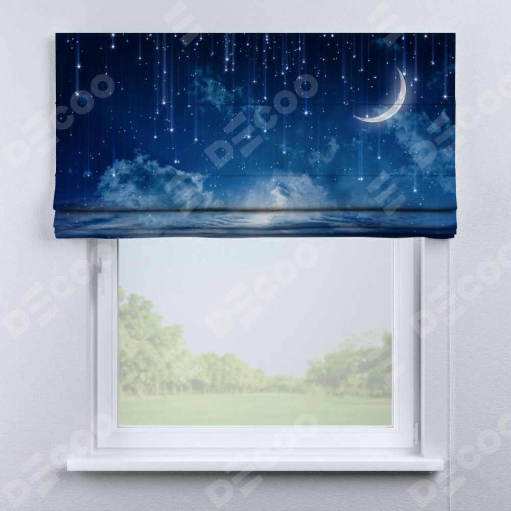 Римская штора производителя «Cortin», используется для проёма, пошита из ткани блэкаут с нанесением сублимационной печати «Ночное небо». Имеет универсальный механизм и подходит для монтажа: на потолок, на стену и в нишу.