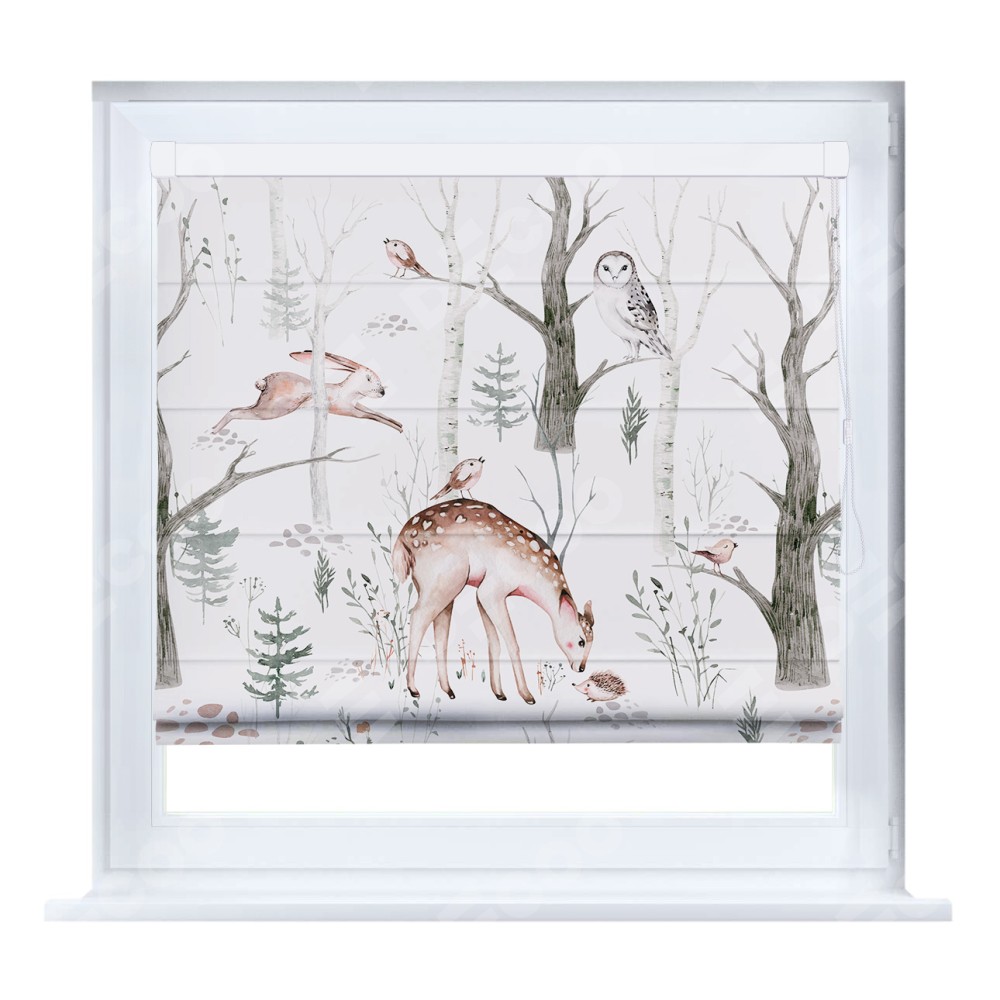 Римская штора кассетного типа, производителя «Cortin», устанавливается только на пластиковые окна и прилегает к стеклопакету, пошита из ткани блэкаут с нанесением сублимационной печати «Скандинавский питомник».