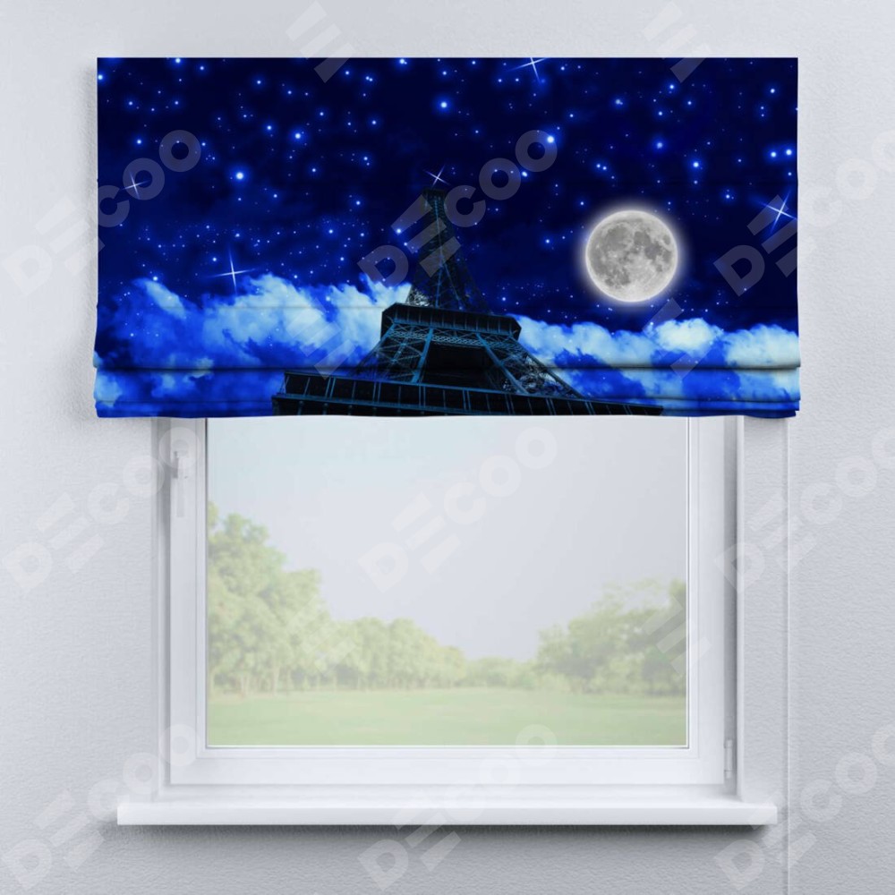 Римская штора производителя «Cortin», используется для проёма, пошита из ткани блэкаут с нанесением сублимационной печати «Ночь в Париже». Имеет универсальный механизм и подходит для монтажа: на потолок, на стену и в нишу.