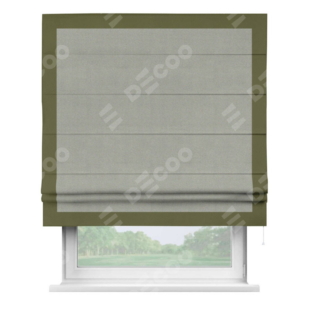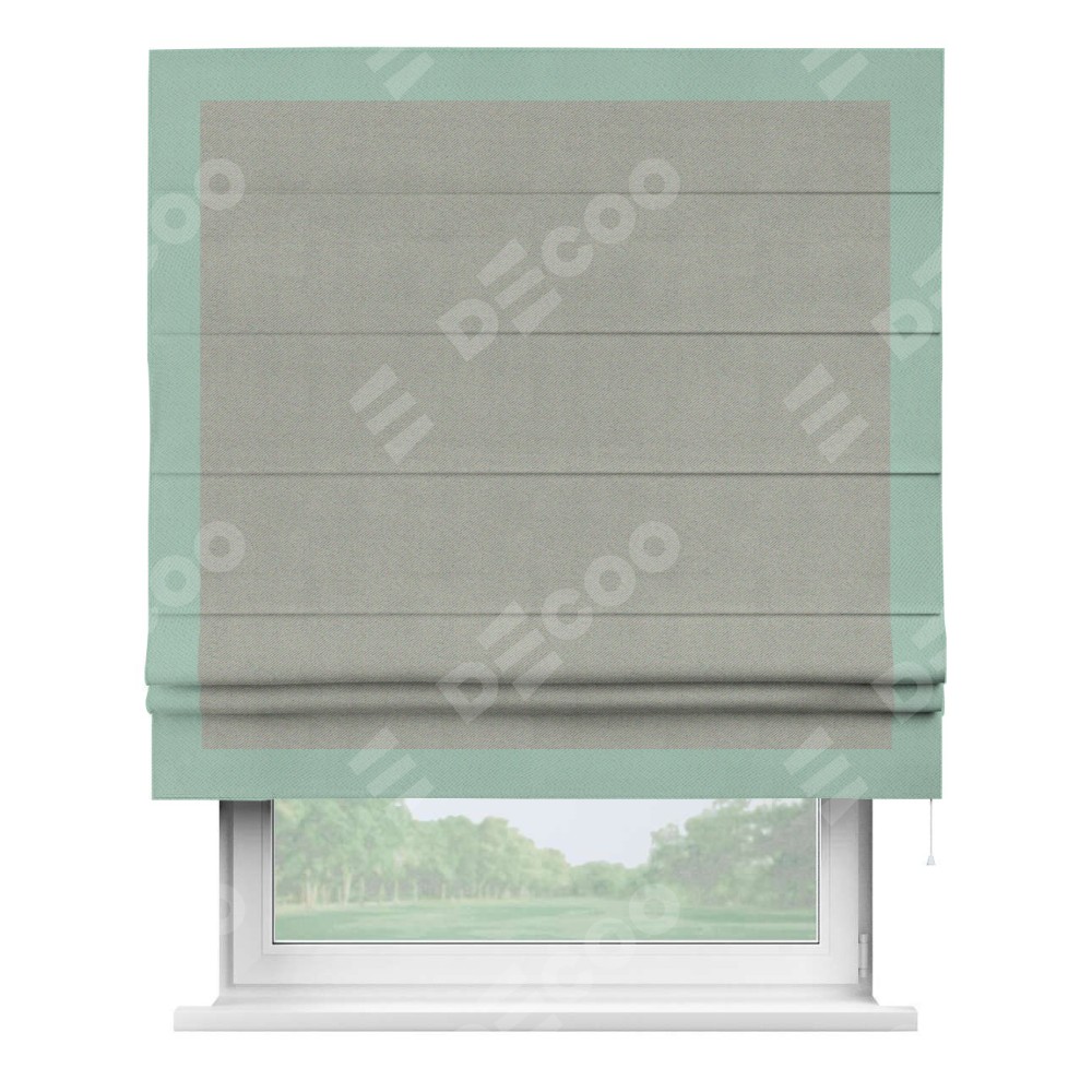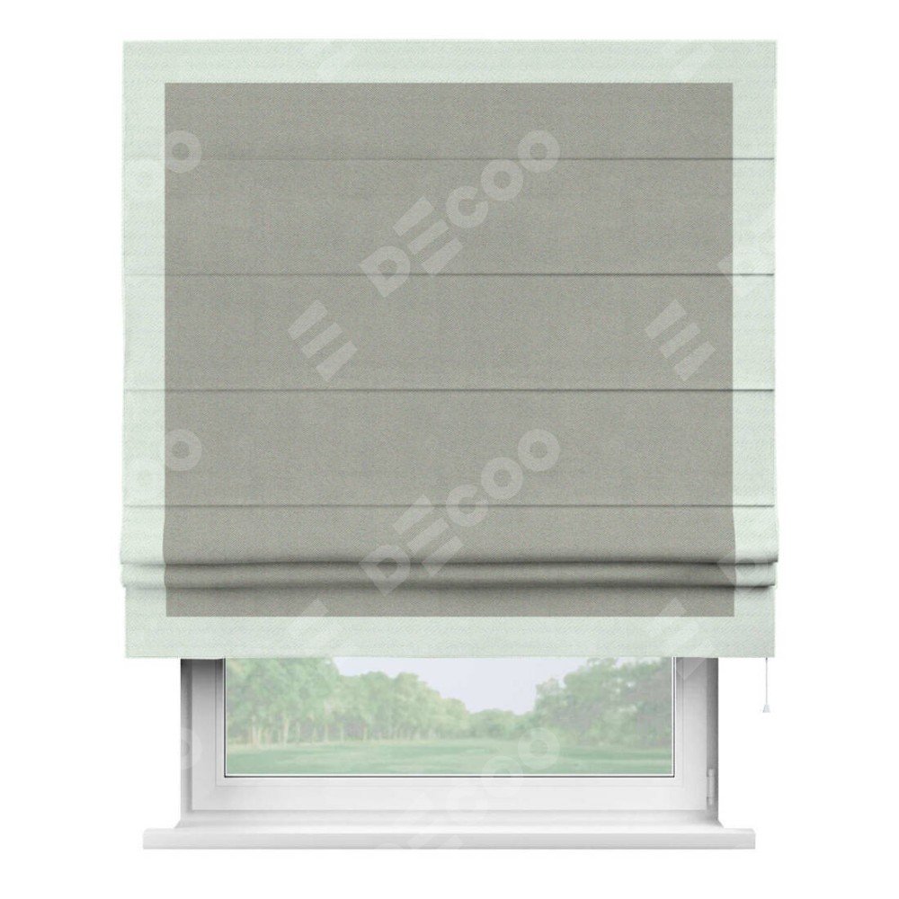 Римская штора производителя «Cortin», используется для проёма, пошита из ткани блэкаут однотонный серый, артикул ткани 88292. Отделка шторы кантом «Чесс», ткань для канта используется из блэкаута однотонного разной расцветки на выбор. Имеет универсальный механизм и подходит для монтажа: на потолок, на стену и в нишу.
