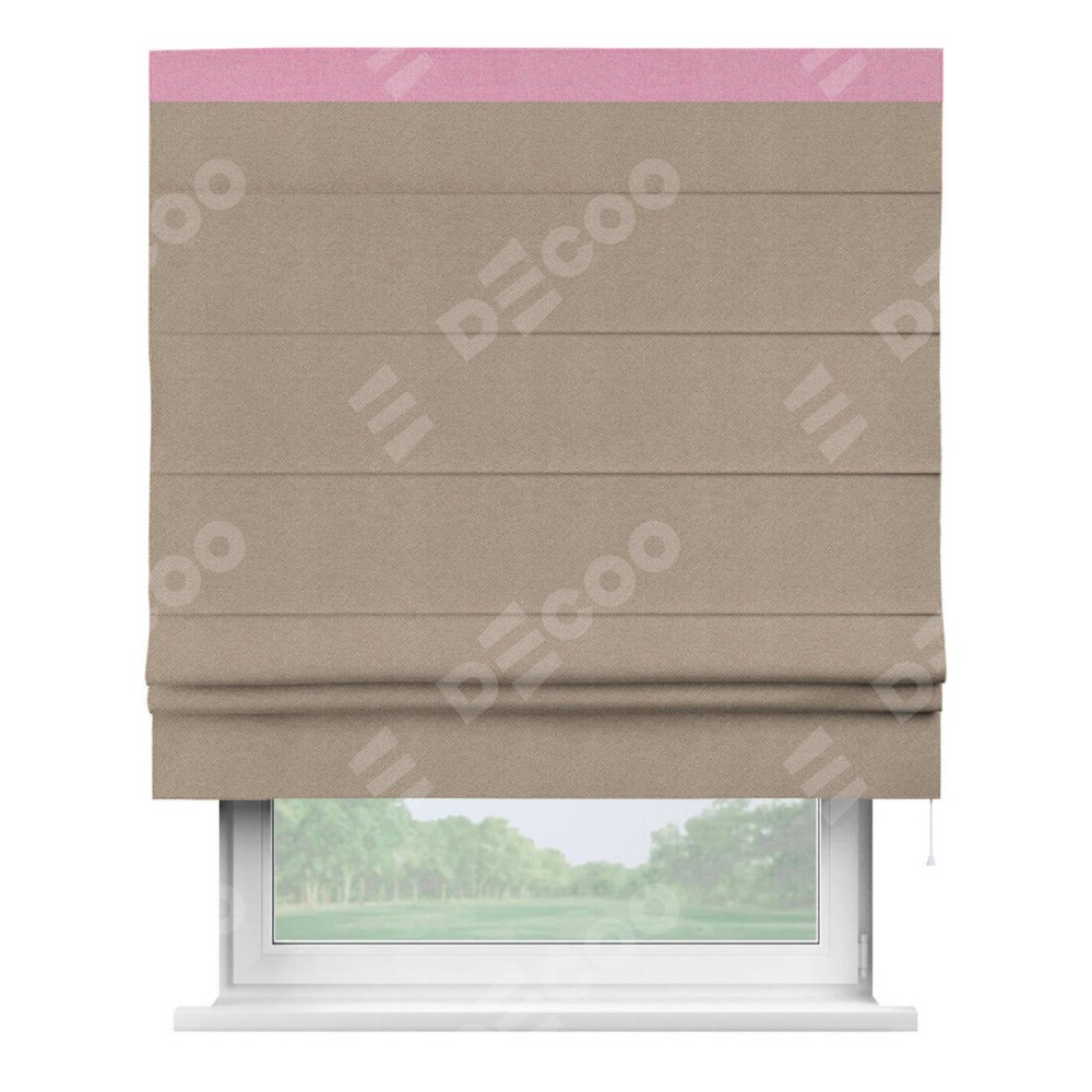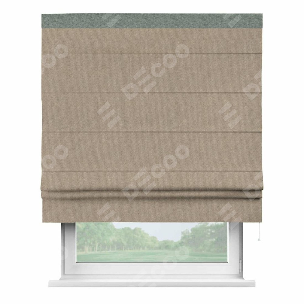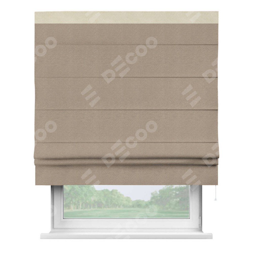 Римская штора производителя «Cortin», используется для проёма, пошита из ткани лён димаут светло-бежевый, артикул 00002. Отделка шторы кантом «Кинг», ткань для канта используется из льна димаут разной расцветки на выбор. Имеет универсальный механизм и подходит для монтажа: на потолок, на стену и в нишу.