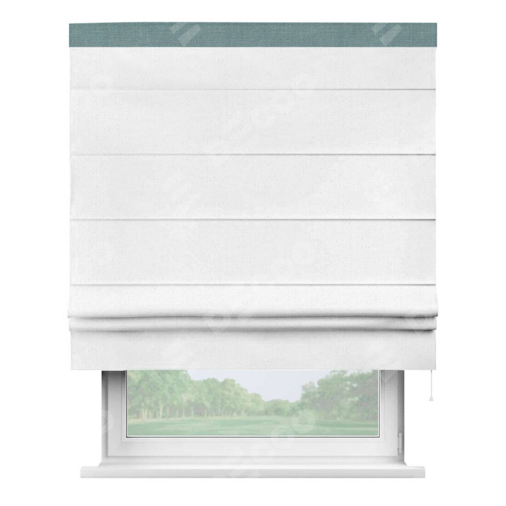 Римская штора производителя «Cortin», используется для проёма, пошита из ткани лён белый, артикул 7439. Отделка шторы кантом «Кинг», ткань для канта используется из льна разной расцветки на выбор. Имеет универсальный механизм и подходит для монтажа: на потолок, на стену и в нишу.