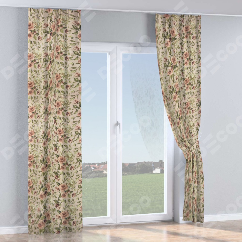 Комплект прямых штор, от производителя «Cortin», пошиты из ткани «Розы бежевые», артикул ткани 34564. С изнаночной стороны в верхней части штор пристрачивается шторная лента с декоративными складками «Кустик». Для создания элегантных складок прямые шторы шьются по стандарту с коэффициентом 1:2 (на 100 см. ширины проёма 200 см. ширины ткани).