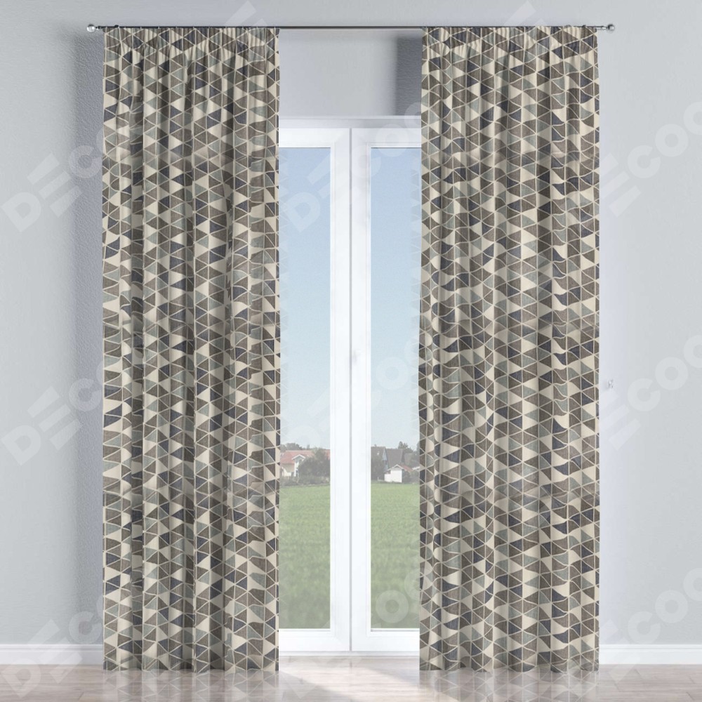 Комплект прямых штор, от производителя «Cortin», пошиты из ткани димаут «Треугольники синие», артикул ткани 23022. С изнаночной стороны в верхней части штор пристрачивается шторная лента с декоративными складками «Карандаш». Для создания элегантных складок прямые шторы шьются по стандарту с коэффициентом 1:2 (на 100 см. ширины проёма 200 см. ширины ткани).