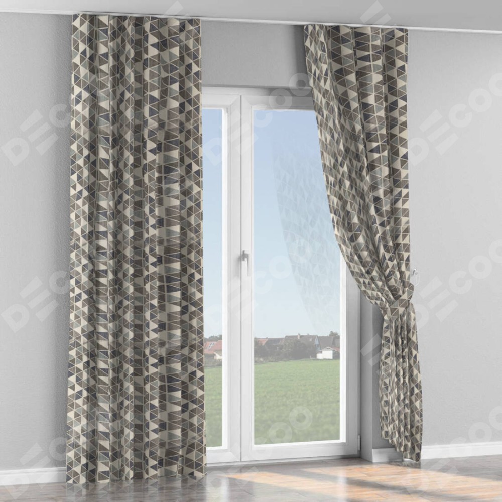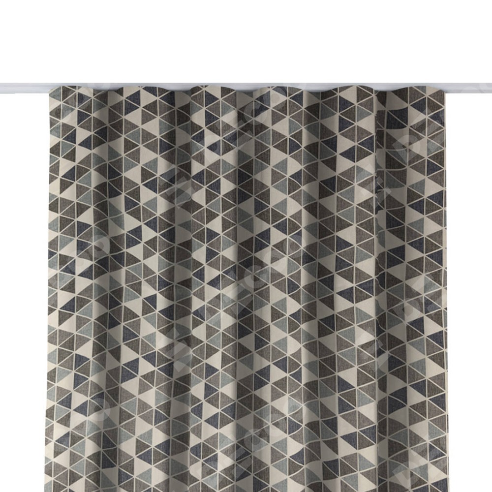 Комплект прямых штор, от производителя «Cortin», пошиты из ткани димаут «Треугольники синие», артикул ткани 23022. С изнаночной стороны в верхней части штор пристрачивается шторная лента с декоративными складками «Волна». Для создания элегантных складок прямые шторы шьются по стандарту с коэффициентом 1:2 (на 100 см. ширины проёма 200 см. ширины ткани).