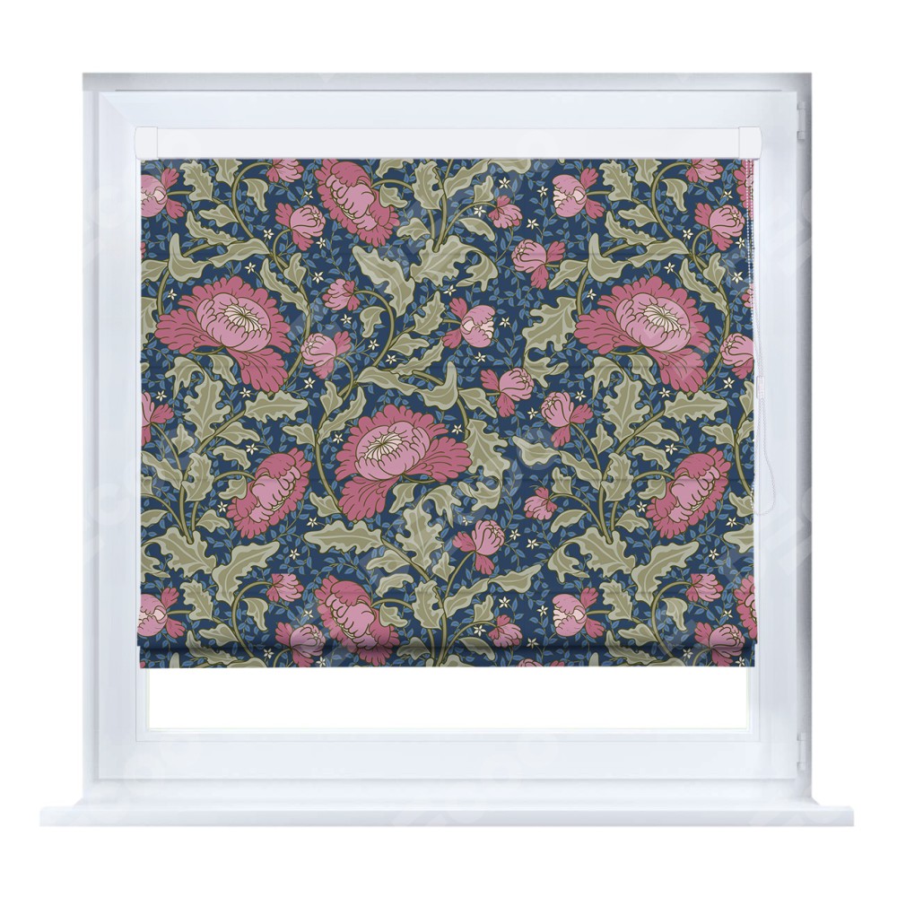 Римская штора кассетного типа, производителя «Cortin», устанавливается только на пластиковые окна и прилегает к стеклопакету, пошита из ткани блэкаут с нанесением сублимационной печати «Розовые цветы».