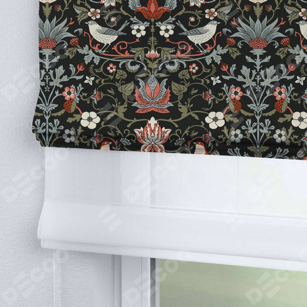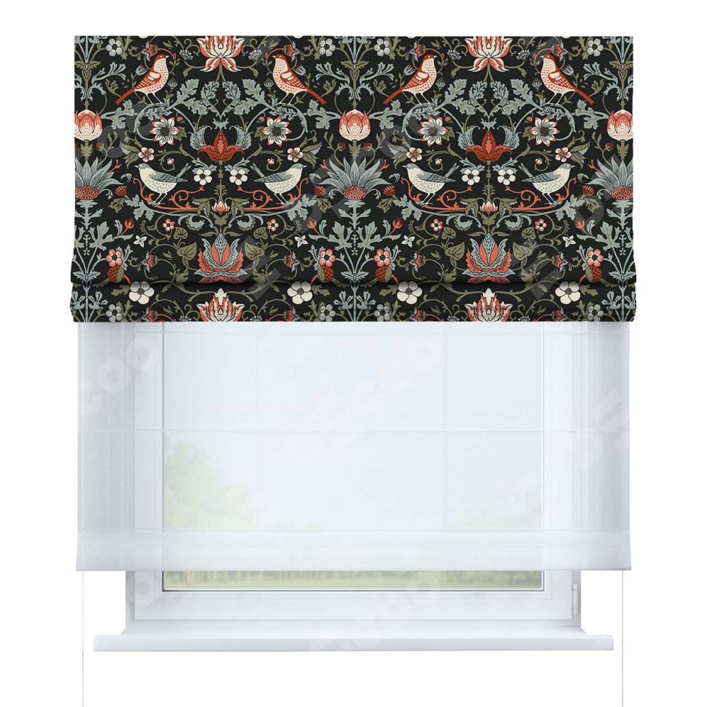 Римская штора день-ночь производителя «Cortin», используется для проёма, пошита из двух полотен, с лицевой блэкаут с нанесением сублимационной печати «Зачарованные птицы», вторая ткань тюль (по стандарту комплектуется тюль белого цвета артикул V-01). Имеет универсальный механизм и подходит для монтажа: на потолок, на стену и в нишу.