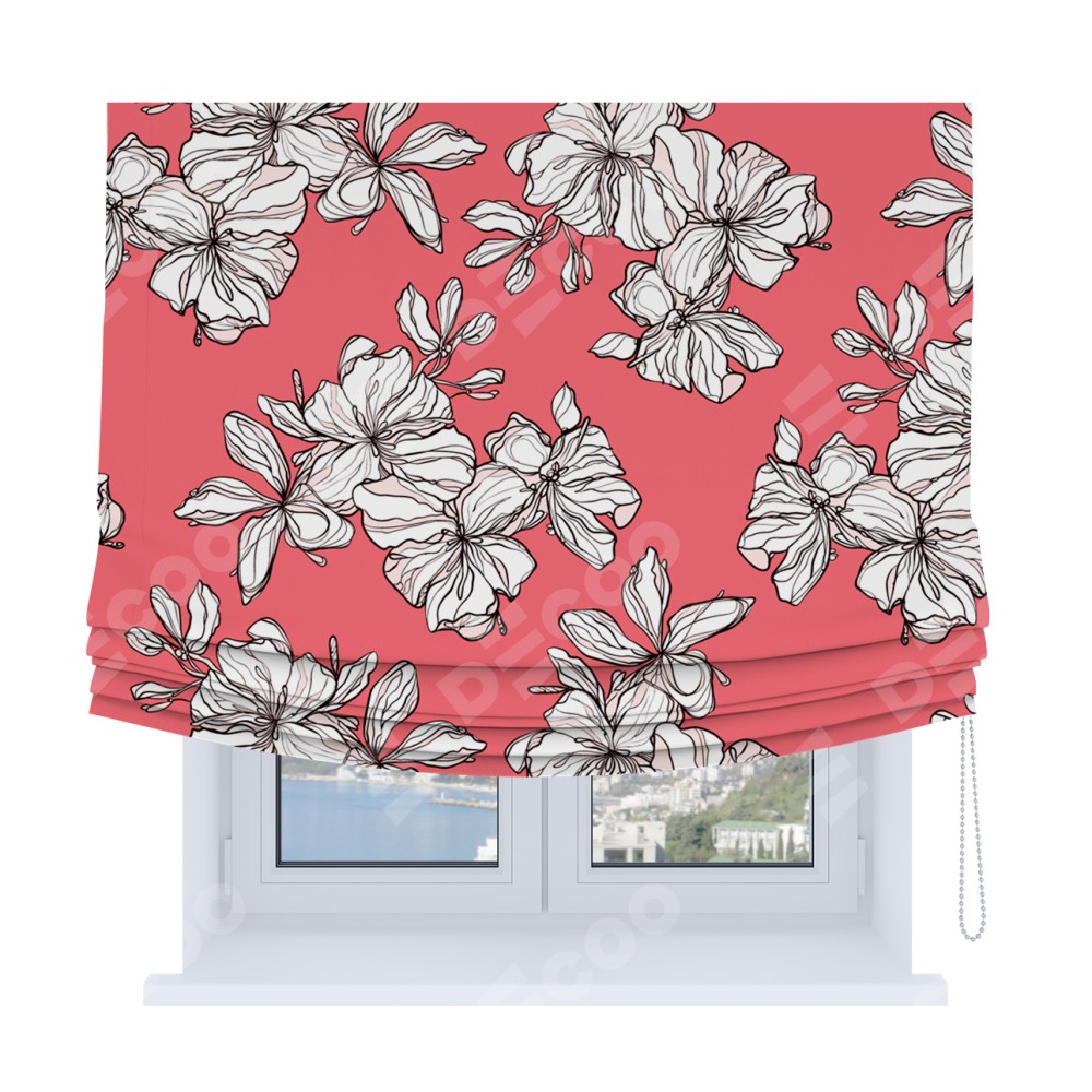 Римская штора Soft производителя «Cortin», используется для проёма, пошита из ткани блэкаут с нанесением сублимационной печати «Белые цветы». Имеет универсальный механизм и подходит для монтажа: на потолок, на стену и в нишу. В отличие от стандартных римских штор, римская штора Soft не имеет горизонтальных вставок и нижнего отвеса. Это позволяет ткани произвольно драпироваться в свободные мягкие складки.