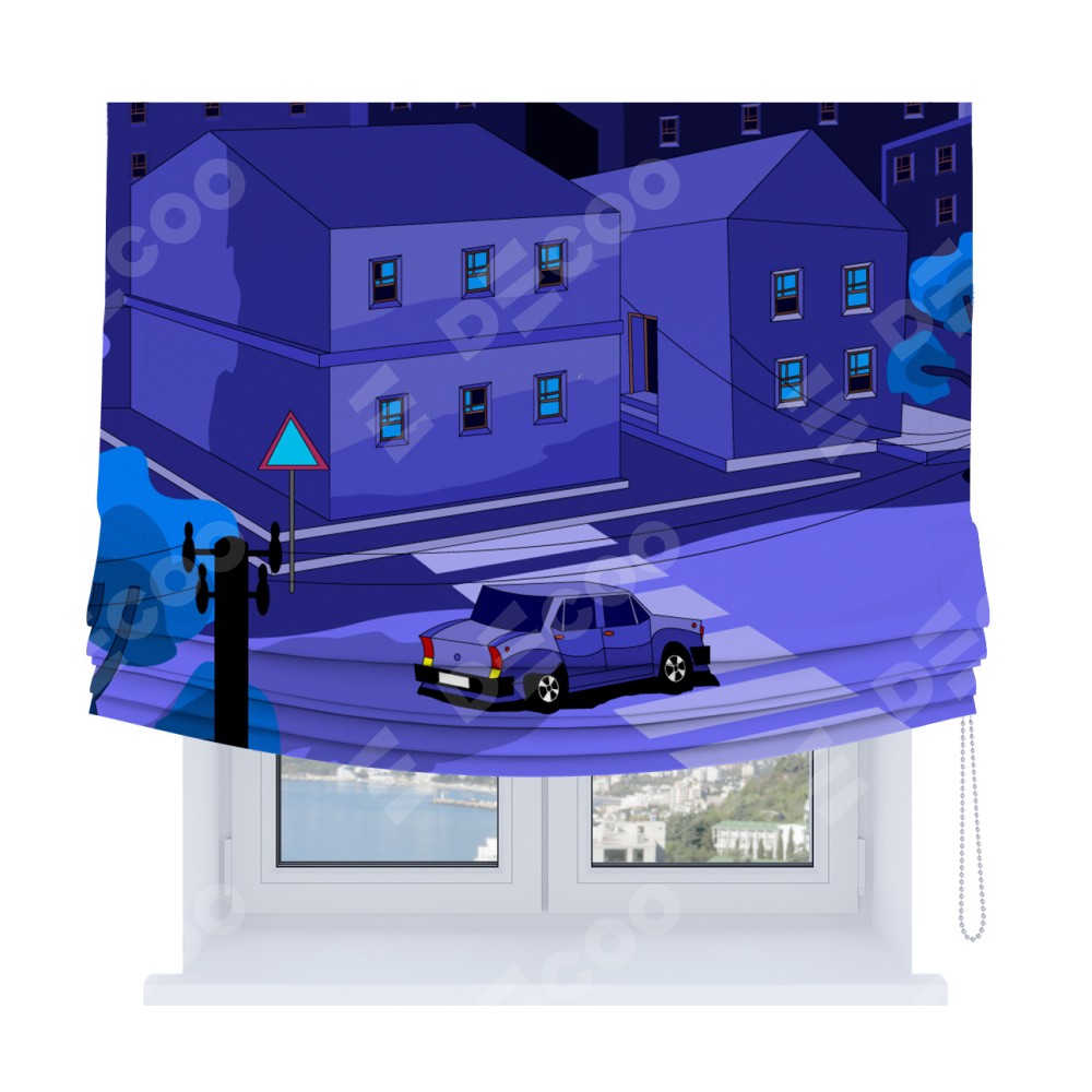 Римская штора Soft производителя «Cortin», используется для проёма, пошита из ткани блэкаут с нанесением сублимационной печати «Ночные улицы». Имеет универсальный механизм и подходит для монтажа: на потолок, на стену и в нишу. В отличие от стандартных римских штор, римская штора Soft не имеет горизонтальных вставок и нижнего отвеса. Это позволяет ткани произвольно драпироваться в свободные мягкие складки.