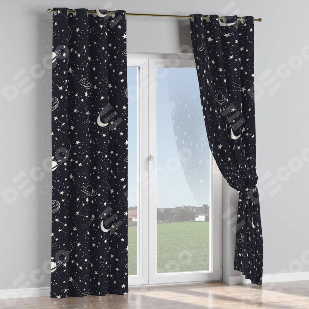 Комплект прямых штор, от производителя «Cortin», пошиты из ткани блэкаут с нанесением сублимационной печати «Глубокий космос». Данная модель пошита на люверсах, комплектуется на выбор круглым карнизом и подходит для монтажа на стену или потолок. Прямые шторы на люверсах шьются по стандарту с коэффициентом 1/2 (на 100 см. ширины проёма 200 см. ширины ткани), отличительным преимуществом данной модели является простой способ монтажа. Достаточно повесить ее на трубу и штора готова!