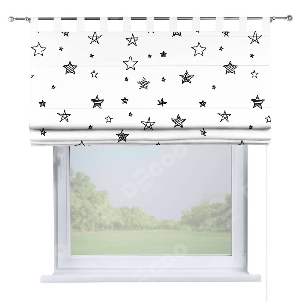 Римская штора производителя «Cortin», используется для проёма, пошита из ткани блэкаут с нанесением сублимационной печати «Звезды». Данная модель пошита на петлях, комплектуется на выбор круглым карнизом и подходит для монтажа на стену. Римская штора на петлях имеет простую систему регулировки высоты, отличительным преимуществом данной модели является простой способ монтажа. Достаточно повесить ее на трубу и штора готова!