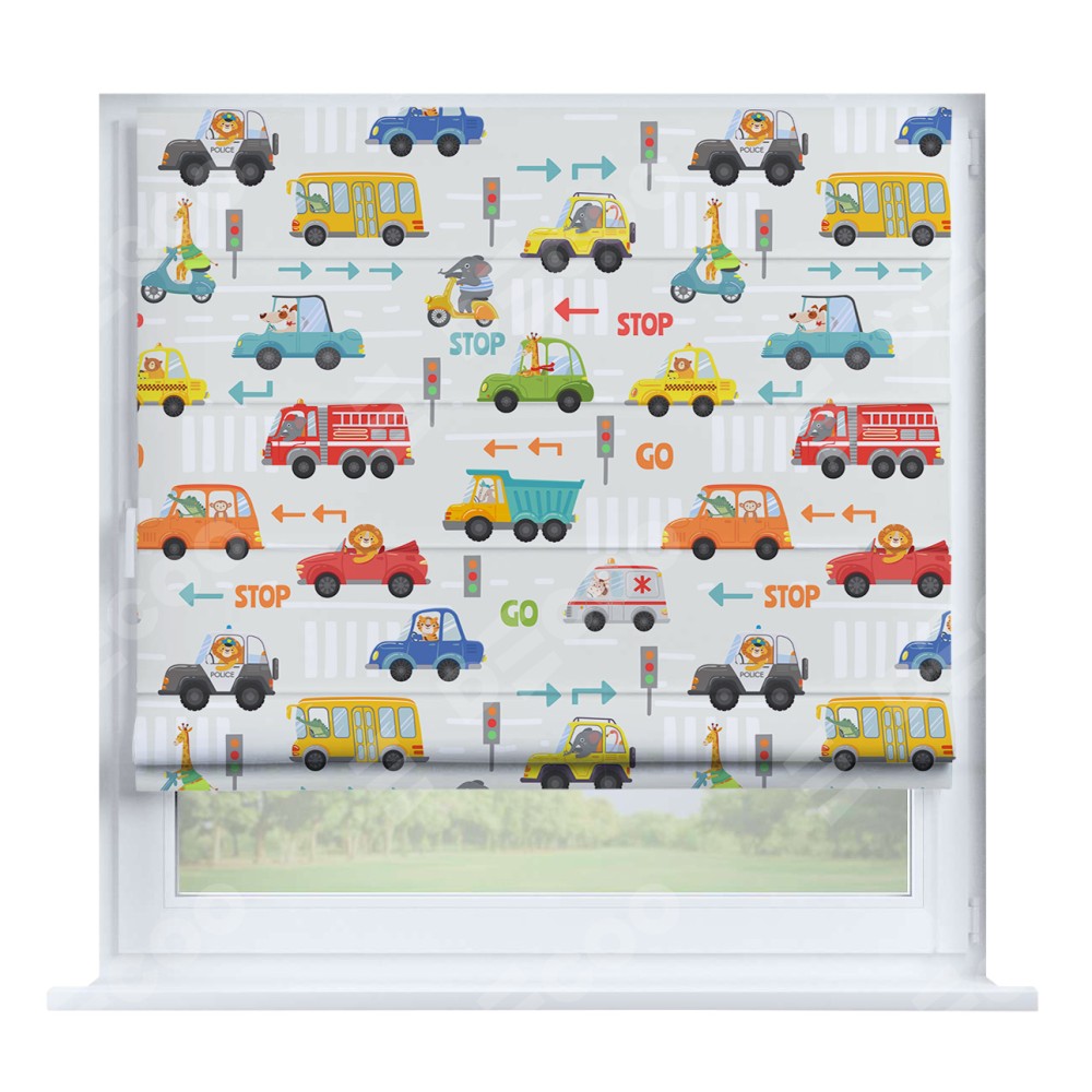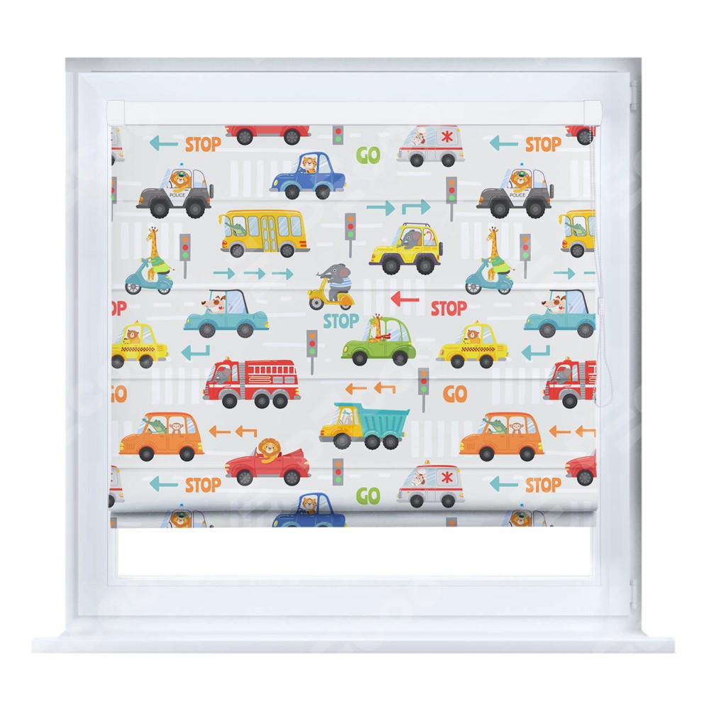 Римская штора производителя «Cortin», устанавливается на створку окна, пошита из ткани блэкаут с нанесением сублимационной печати «Дорожные правила». Штора шьётся по индивидуальным размерам, для данного типа римской шторы возможная ширина от 35 до 150 см., высота до 250 см.