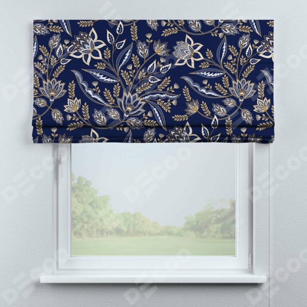 Римская штора производителя «Cortin», используется для проёма, пошита из ткани блэкаут с нанесением сублимационной печати «Индиго батик». Имеет универсальный механизм и подходит для монтажа: на потолок, на стену и в нишу.