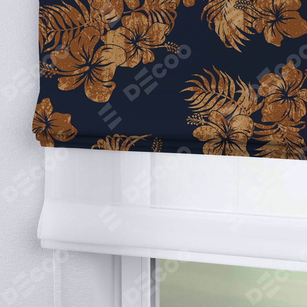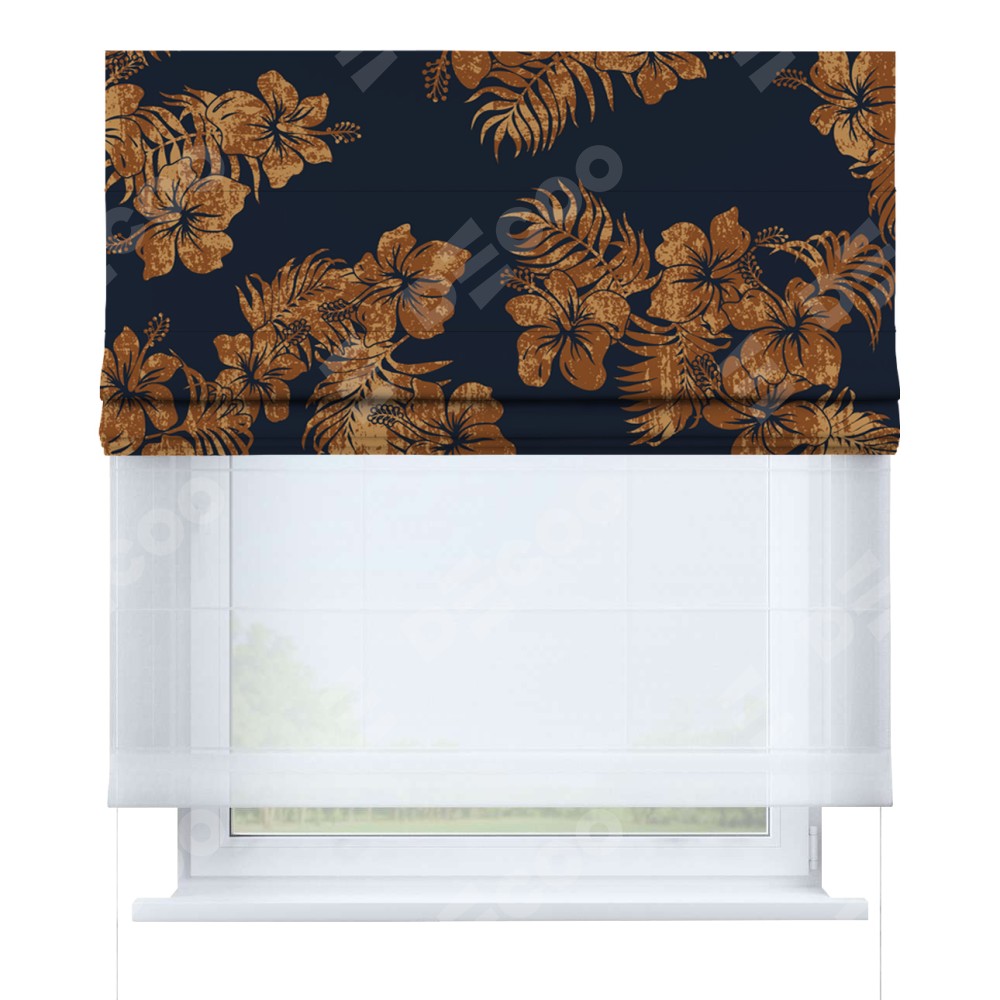 Римская штора день-ночь производителя «Cortin», используется для проёма, пошита из двух полотен, с лицевой блэкаут с нанесением сублимационной печати «Китайская роза», вторая ткань тюль (по стандарту комплектуется тюль белого цвета артикул V-01). Имеет универсальный механизм и подходит для монтажа: на потолок, на стену и в нишу.