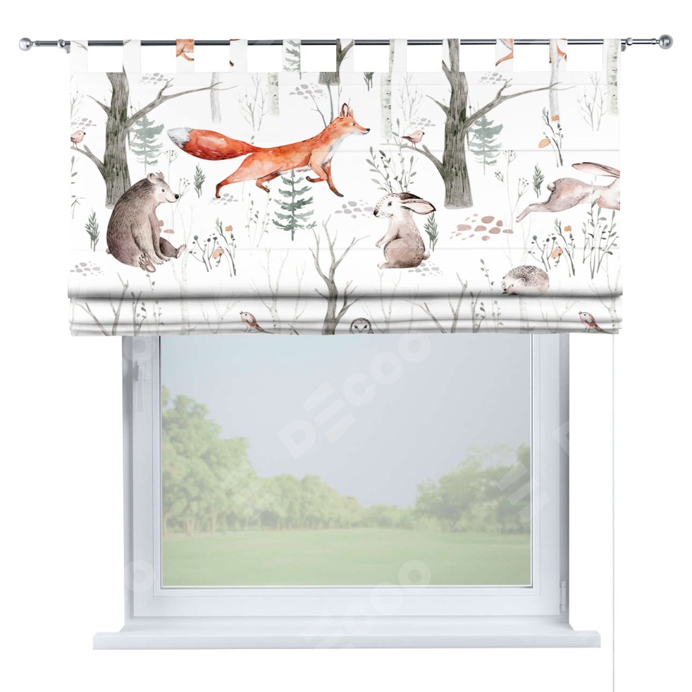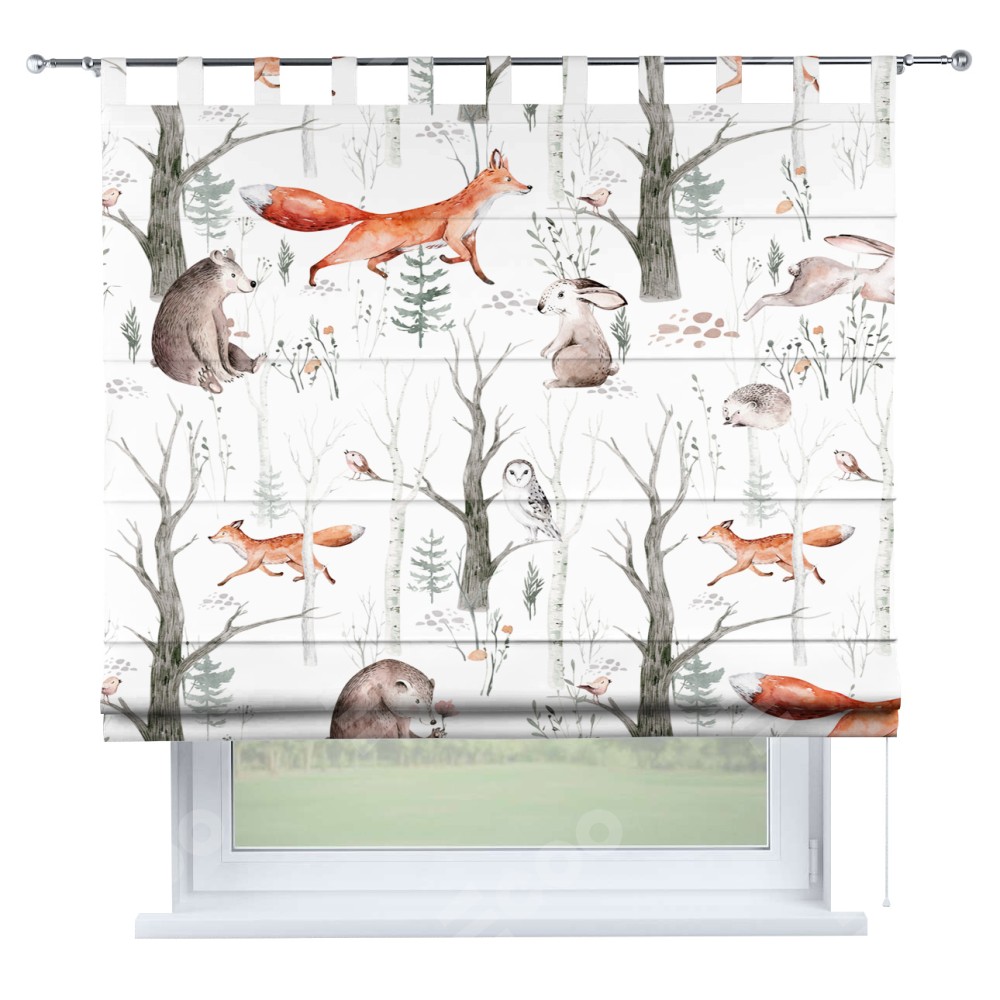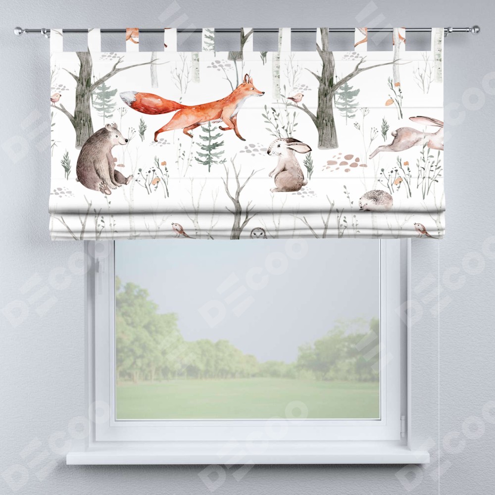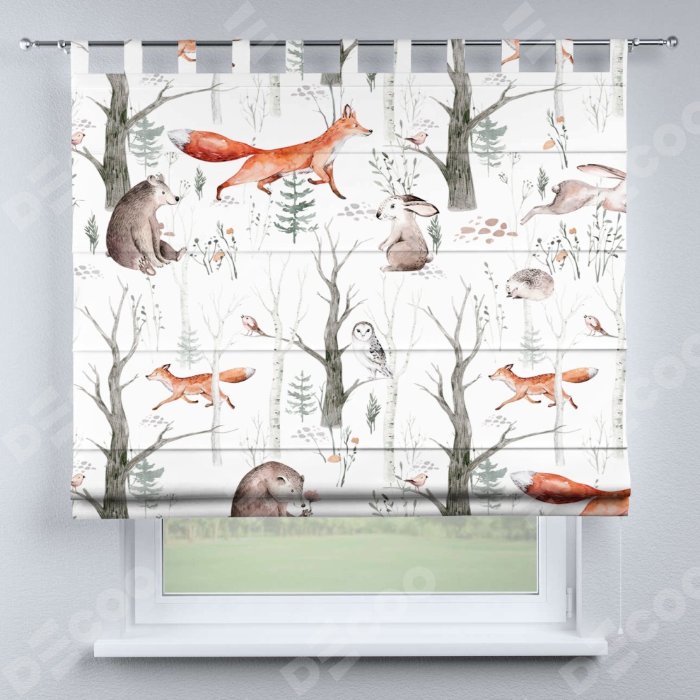 Римская штора производителя «Cortin», используется для проёма, пошита из ткани блэкаут с нанесением сублимационной печати «Лесной питомник». Данная модель пошита на петлях, комплектуется на выбор круглым карнизом и подходит для монтажа на стену. Римская штора на петлях имеет простую систему регулировки высоты, отличительным преимуществом данной модели является простой способ монтажа. Достаточно повесить ее на трубу и штора готова!