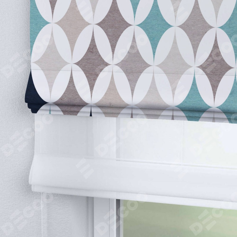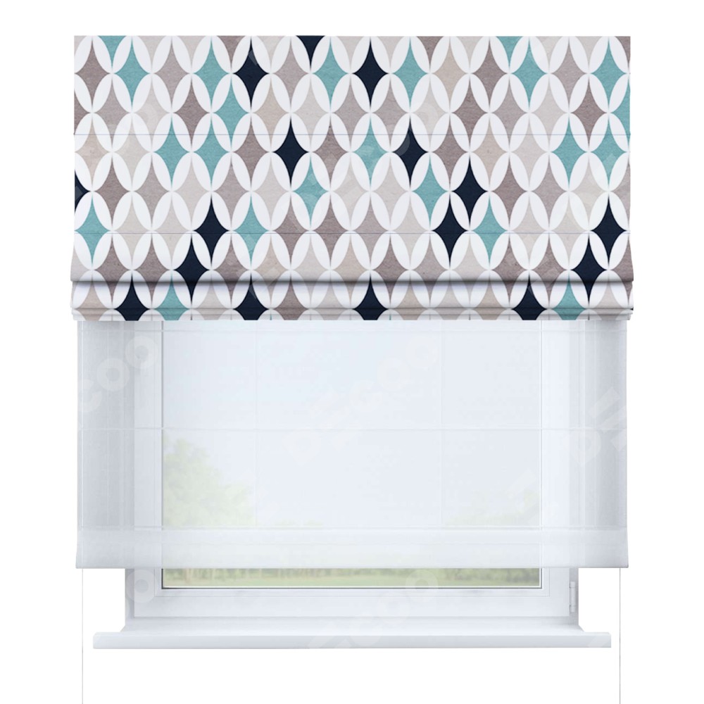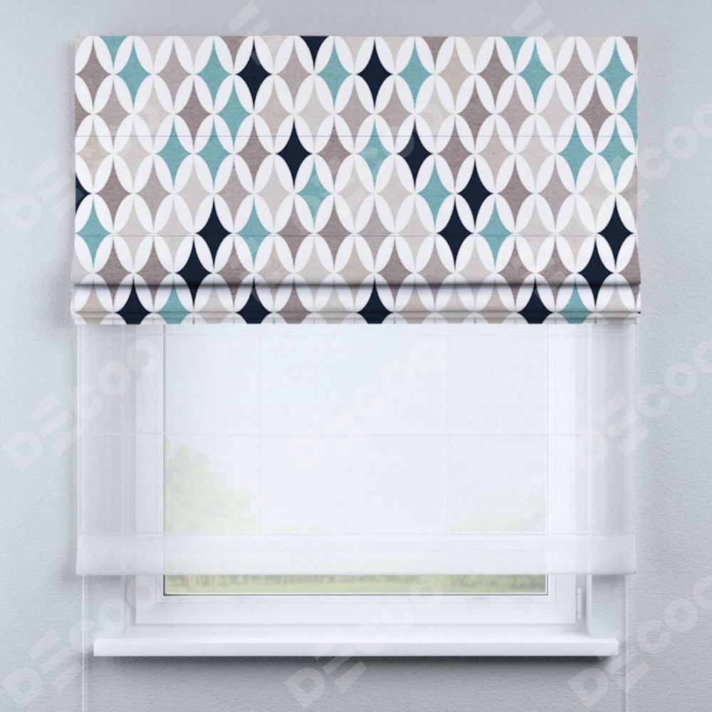 Римская штора день-ночь производителя «Cortin», используется для проёма, пошита из двух полотен, с лицевой блэкаут с нанесением сублимационной печати «Орнамент кристалл», вторая ткань тюль (по стандарту комплектуется тюль белого цвета артикул V-01). Имеет универсальный механизм и подходит для монтажа: на потолок, на стену и в нишу.