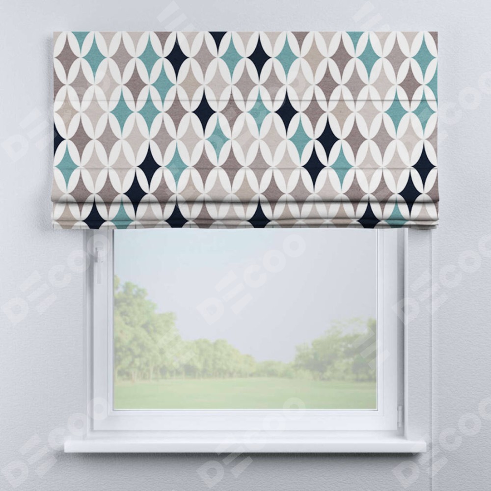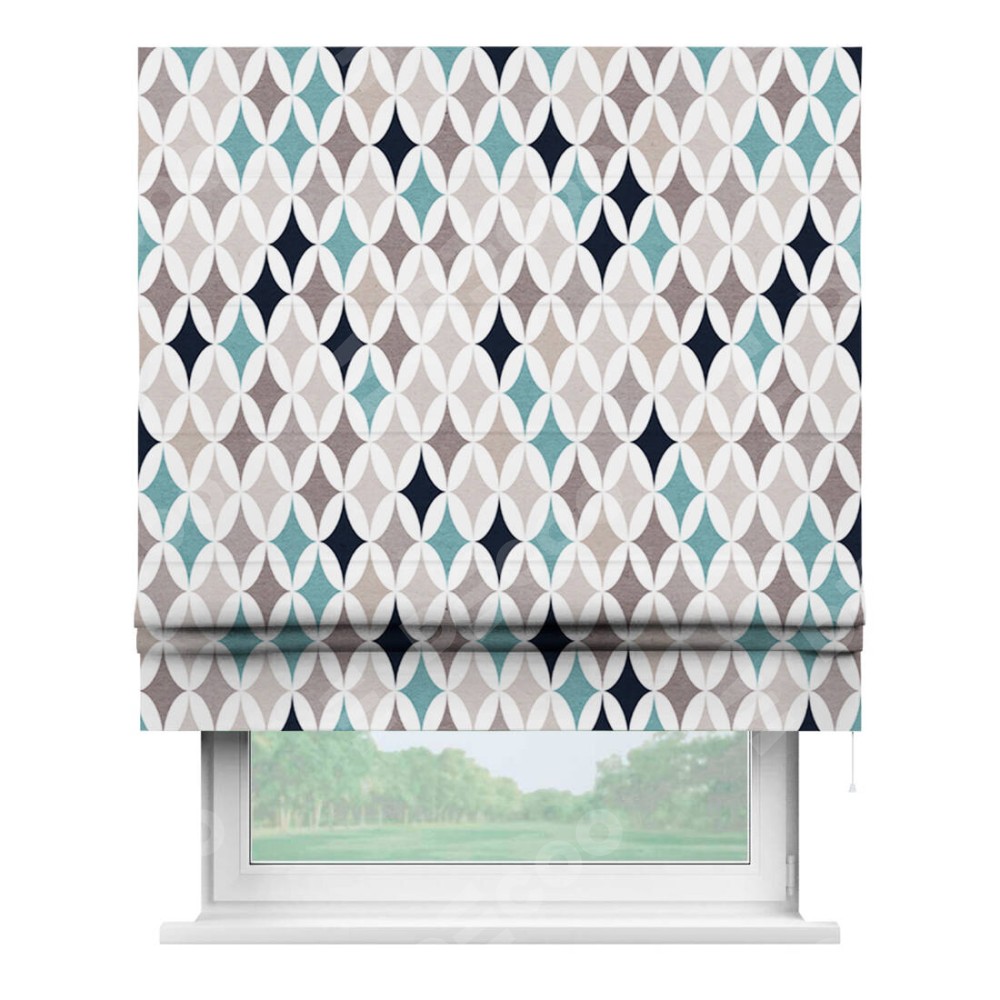 Римская штора производителя «Cortin», используется для проёма, пошита из ткани блэкаут с нанесением сублимационной печати «Орнамент кристалл». Имеет универсальный механизм и подходит для монтажа: на потолок, на стену и в нишу.