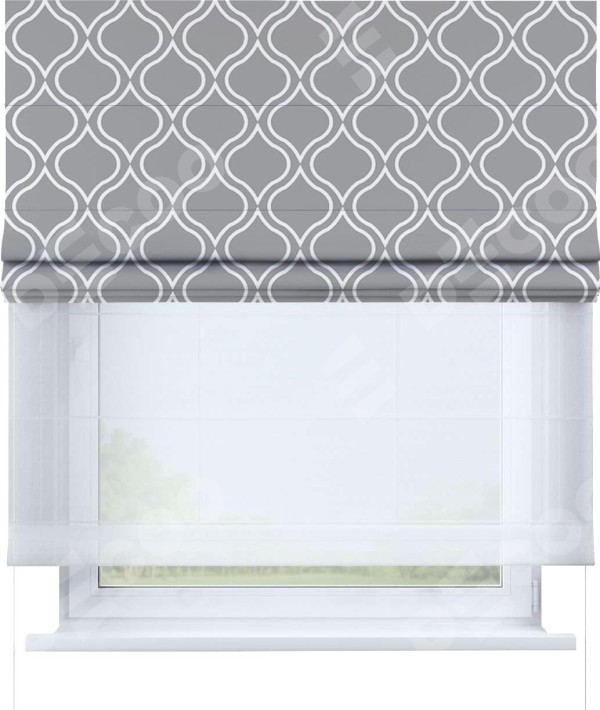 Римская штора день-ночь производителя «Cortin», используется для проёма, пошита из двух полотен, с лицевой блэкаут с нанесением сублимационной печати «Тайны востока серый», вторая ткань тюль (по стандарту комплектуется тюль белого цвета артикул V-01). Имеет универсальный механизм и подходит для монтажа: на потолок, на стену и в нишу.
