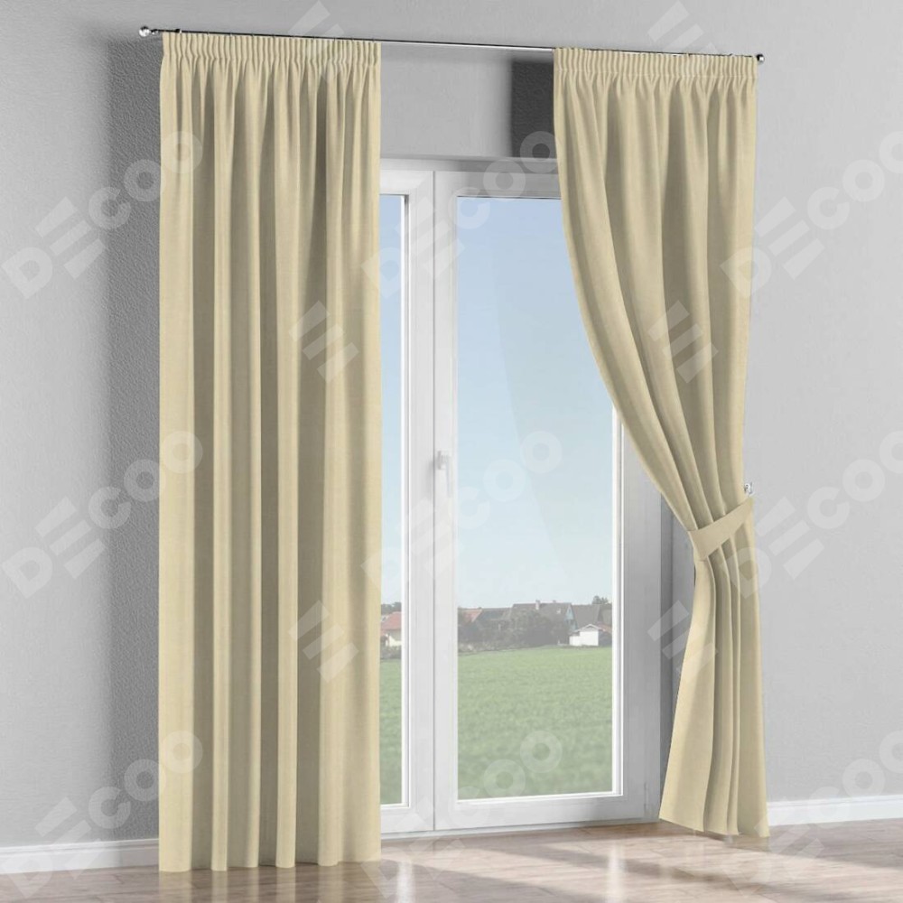 Комплект прямых штор, от производителя «Cortin», пошиты из ткани блэкаут однотонный бежевый, артикул ткани 13125. С изнаночной стороны в верхней части штор пристрачивается шторная лента с декоративными складками «Карандаш». Для создания элегантных складок прямые шторы шьются по стандарту с коэффициентом 1:2 (на 100 см. ширины проёма 200 см. ширины ткани).