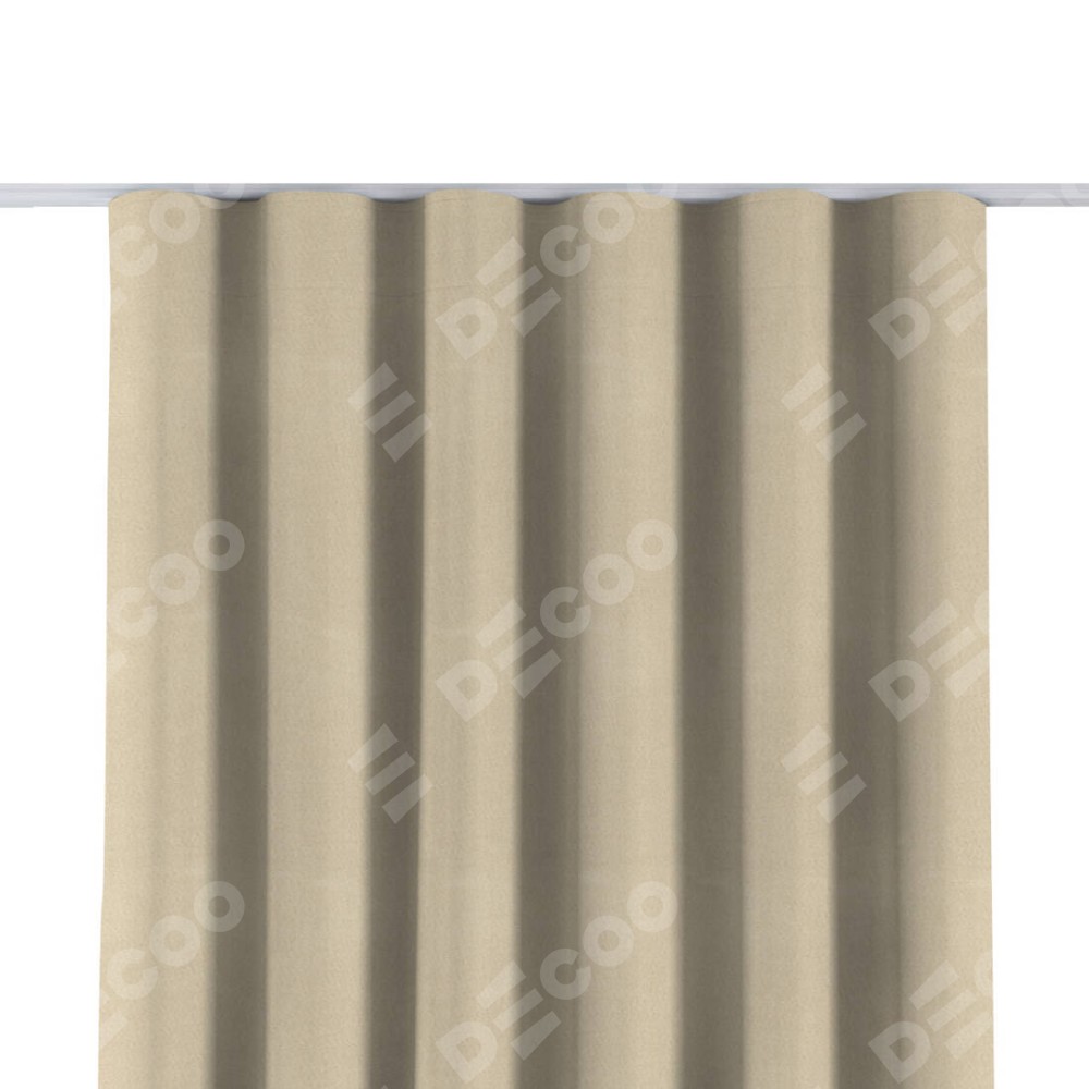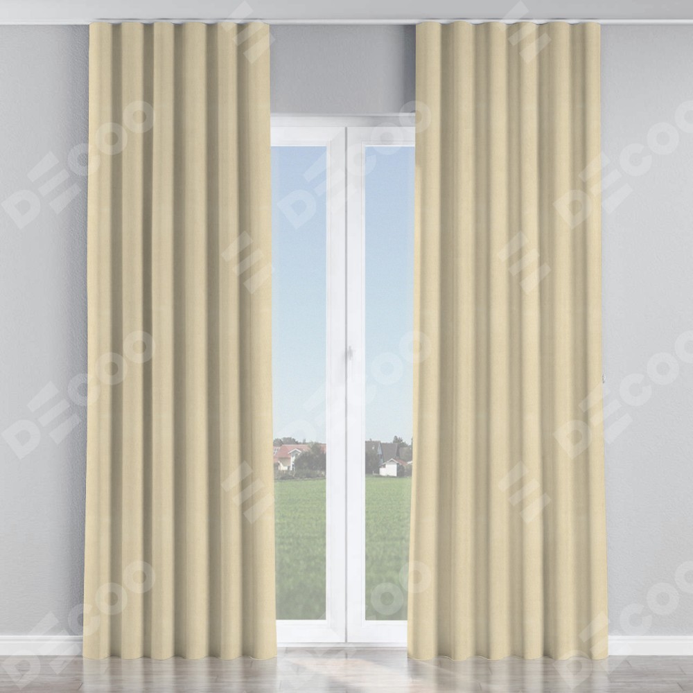 Комплект прямых штор, от производителя «Cortin», пошиты из ткани блэкаут однотонный бежевый, артикул ткани 13125. С изнаночной стороны в верхней части штор пристрачивается шторная лента с декоративными складками «Волна». Для создания элегантных складок прямые шторы шьются по стандарту с коэффициентом 1:2 (на 100 см. ширины проёма 200 см. ширины ткани).