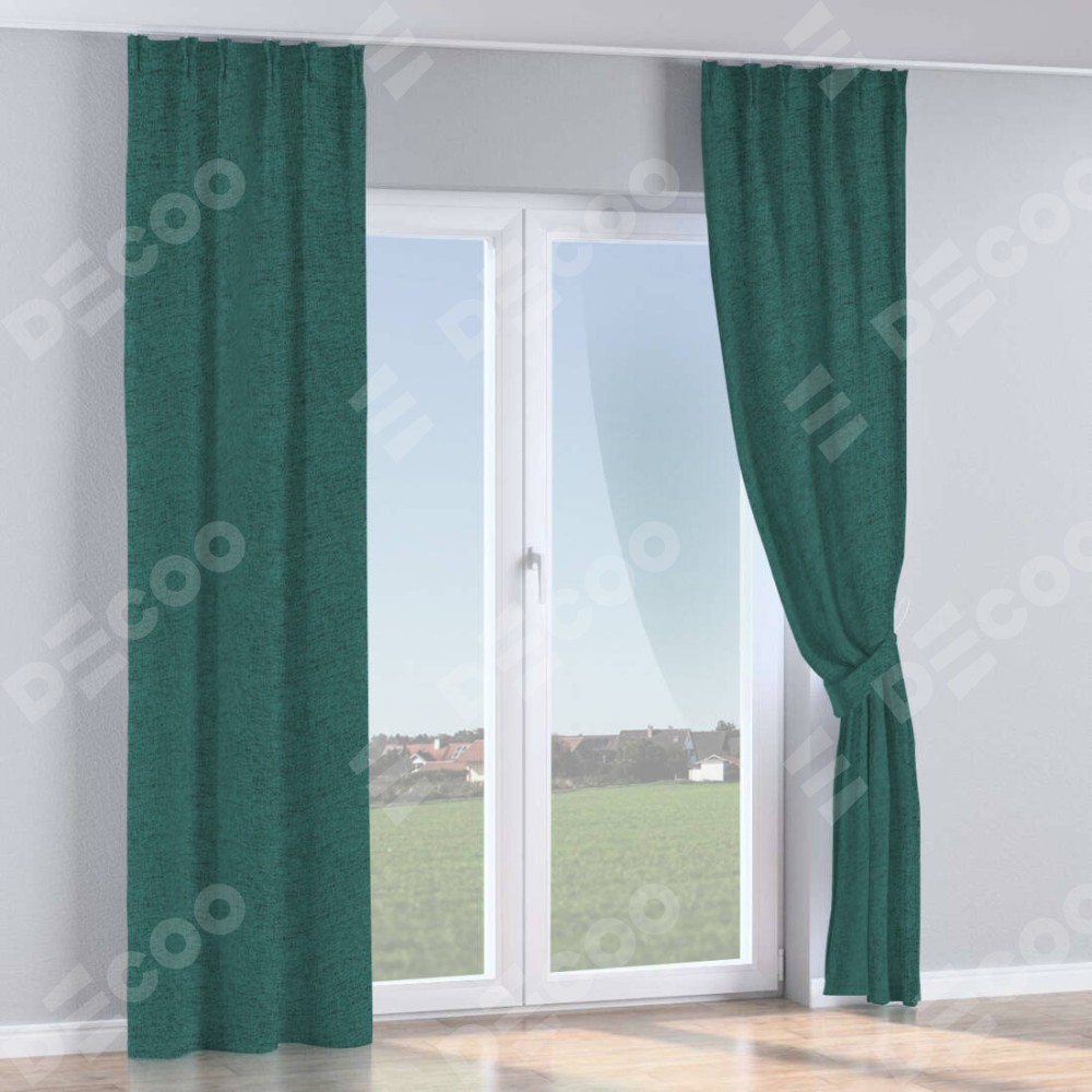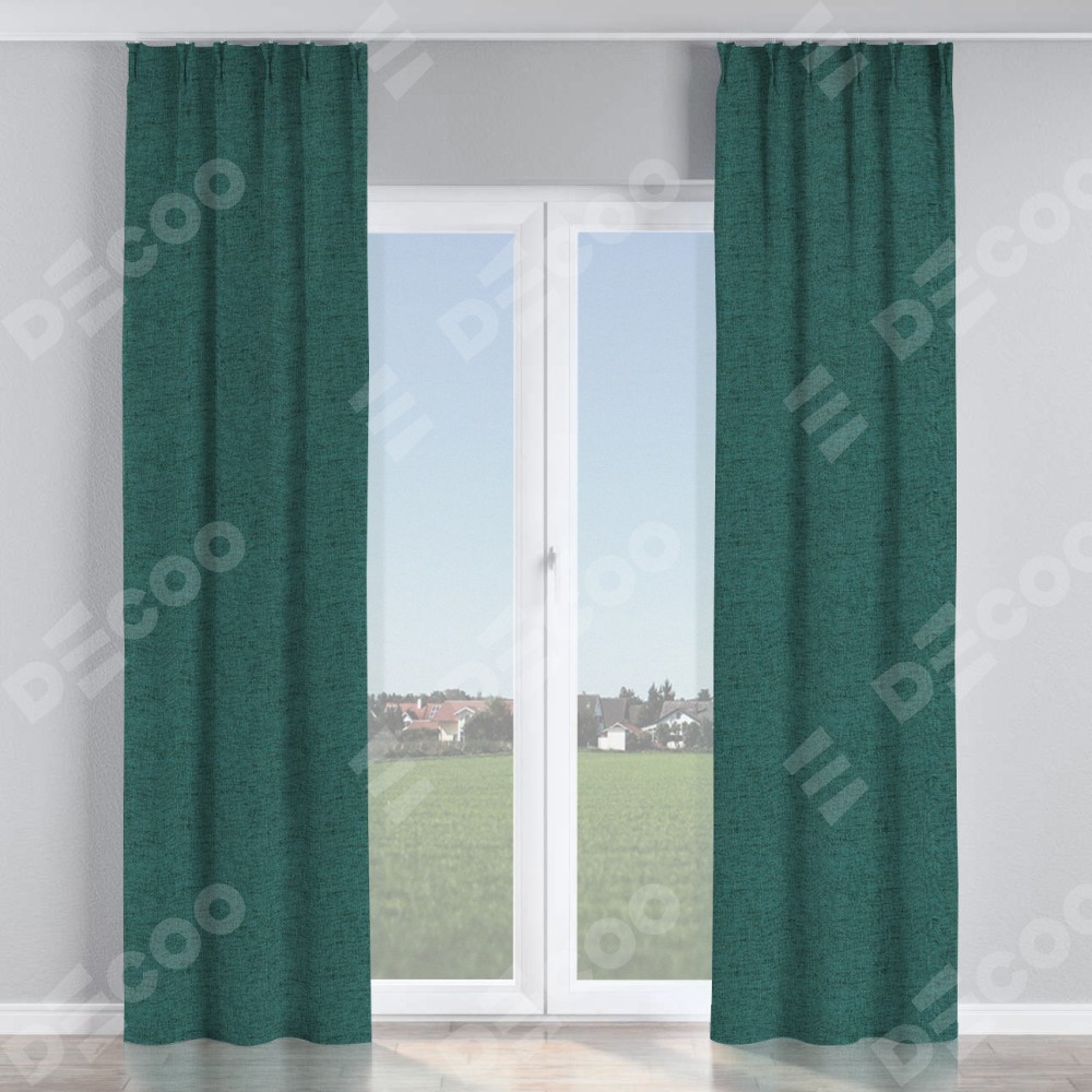Комплект прямых штор, от производителя «Cortin», пошиты из ткани стиф димаут сине-зелёный, артикул ткани 18194. С изнаночной стороны в верхней части штор пристрачивается шторная лента с декоративными складками «Кустик». Для создания элегантных складок прямые шторы шьются по стандарту с коэффициентом 1:2 (на 100 см. ширины проёма 200 см. ширины ткани).