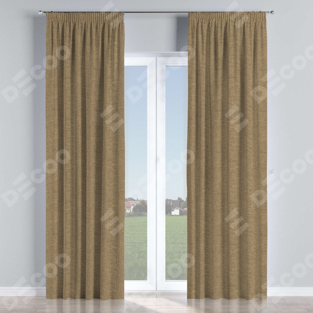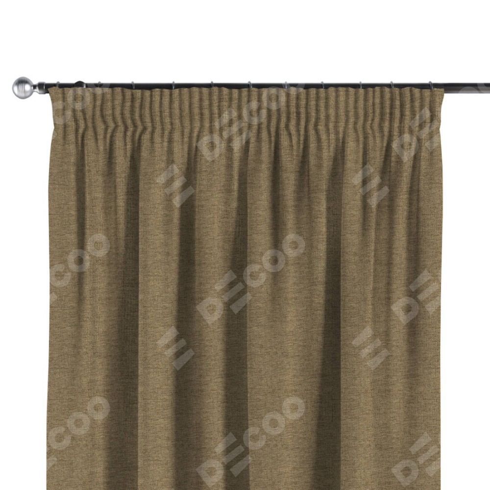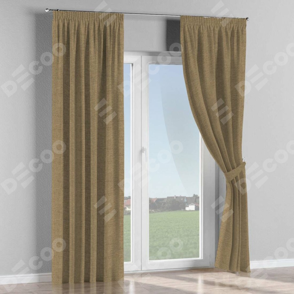Комплект прямых штор, от производителя «Cortin», пошиты из ткани стиф димаут тёмно-бежевый, артикул ткани 18085. С изнаночной стороны в верхней части штор пристрачивается шторная лента с декоративными складками «Карандаш». Для создания элегантных складок прямые шторы шьются по стандарту с коэффициентом 1:2 (на 100 см. ширины проёма 200 см. ширины ткани).