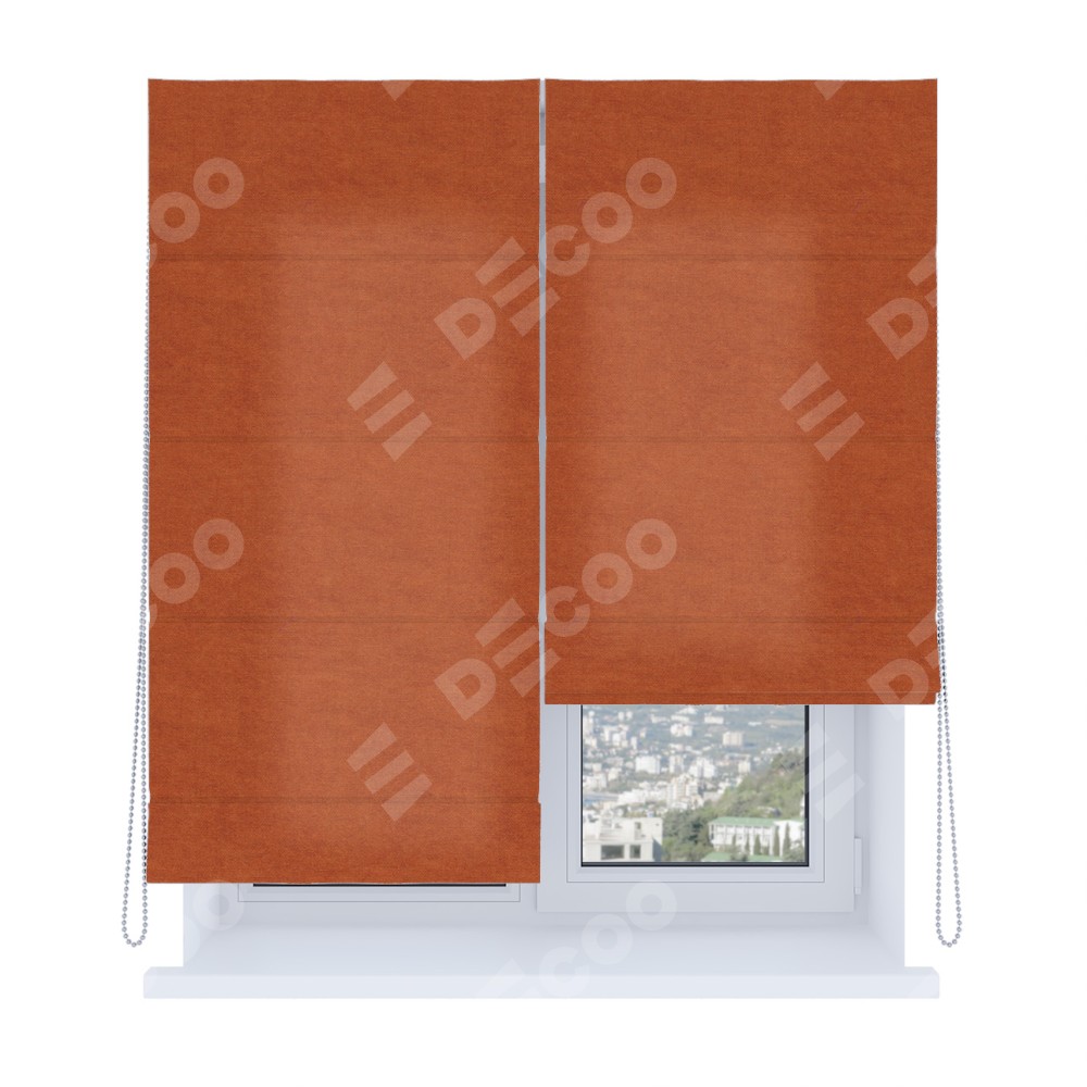 Римская штора производителя «Cortin», используется для проёма, пошита из ткани вельвет терракотовый, артикул ткани 85548. Имеет универсальный механизм и подходит для монтажа: на потолок, на стену и в нишу. Удобное управление каждой шторой отдельно.